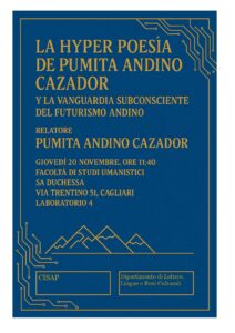 Luisín Benjamín Días Padilla, “La hyper poesía de Pumita Andino Cazador; y la vanguardia subconsciente del futurismo andino”; Lab. 4 (Sa Duchessa Campus, via Trentino 51, Cagliari)