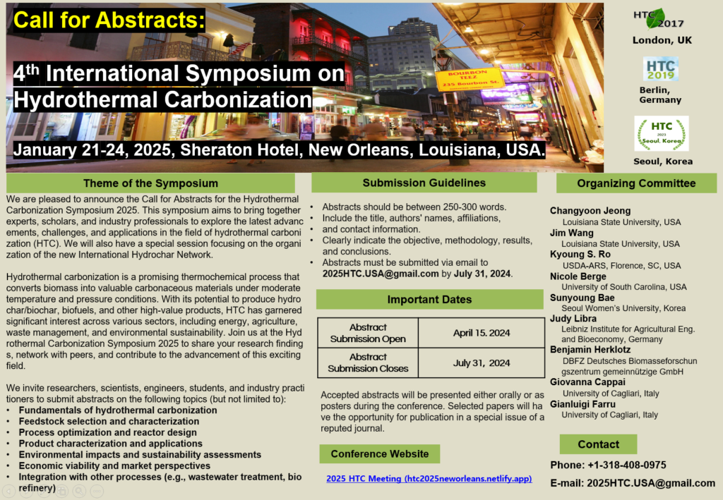 The 4th International Symposium on Hydrothermal Carbonization was held in New Orleans from January 21 to 24, 2025, bringing together researchers, industry professionals, and scholars from around the world. The event featured in-depth discussions on recent advancements, challenges, and applications in hydrothermal carbonization (HTC), covering a wide range of topics from process optimization to environmental impacts.