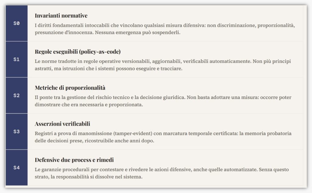Il primo livello, S0, riguarda le invarianti normative: quei principi fondamentali che non possono essere sacrificati neppure in presenza di esigenze difensive, come la non discriminazione, la proporzionalità e la presunzione d’innocenza. Questi principi operano come vincoli strutturali di qualsiasi risposta tecnica o organizzativa.