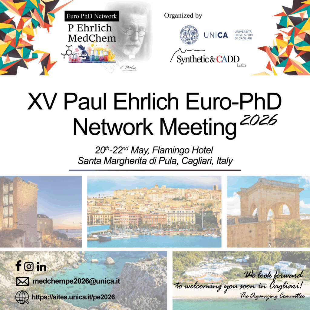 We are pleased to announce the upcoming International Paul Ehrlich MedChem 2026 conference (#PE2026) – May 20th – 22nd, 2026 – at the Hotel Flamingo Resort in Santa Margherita di Pula (CA), Italy, organized by the “CADD, Synthesis and Extraction of Bioactive Compounds MedChem” research group with the support of the University of Cagliari (UNICA).