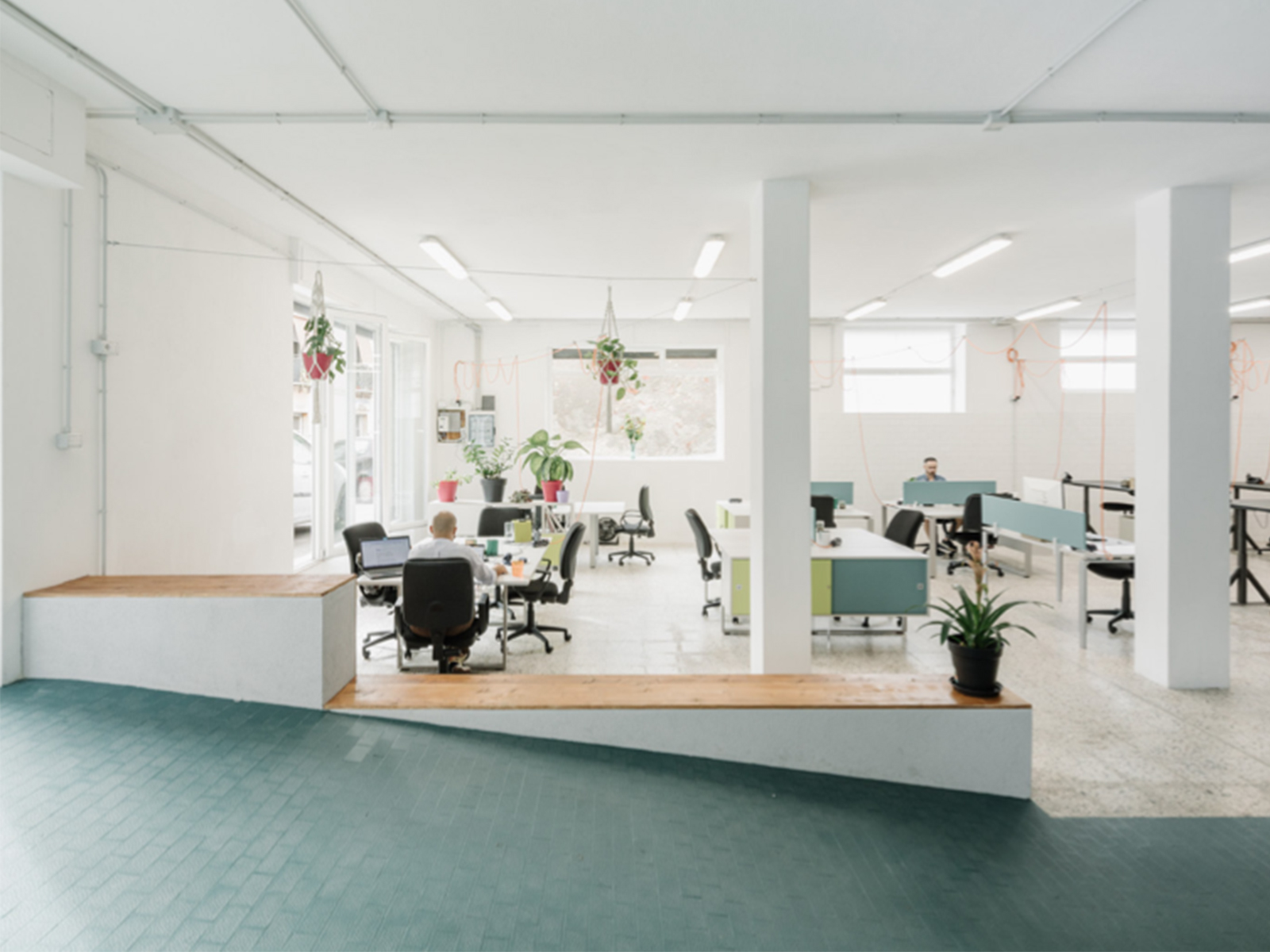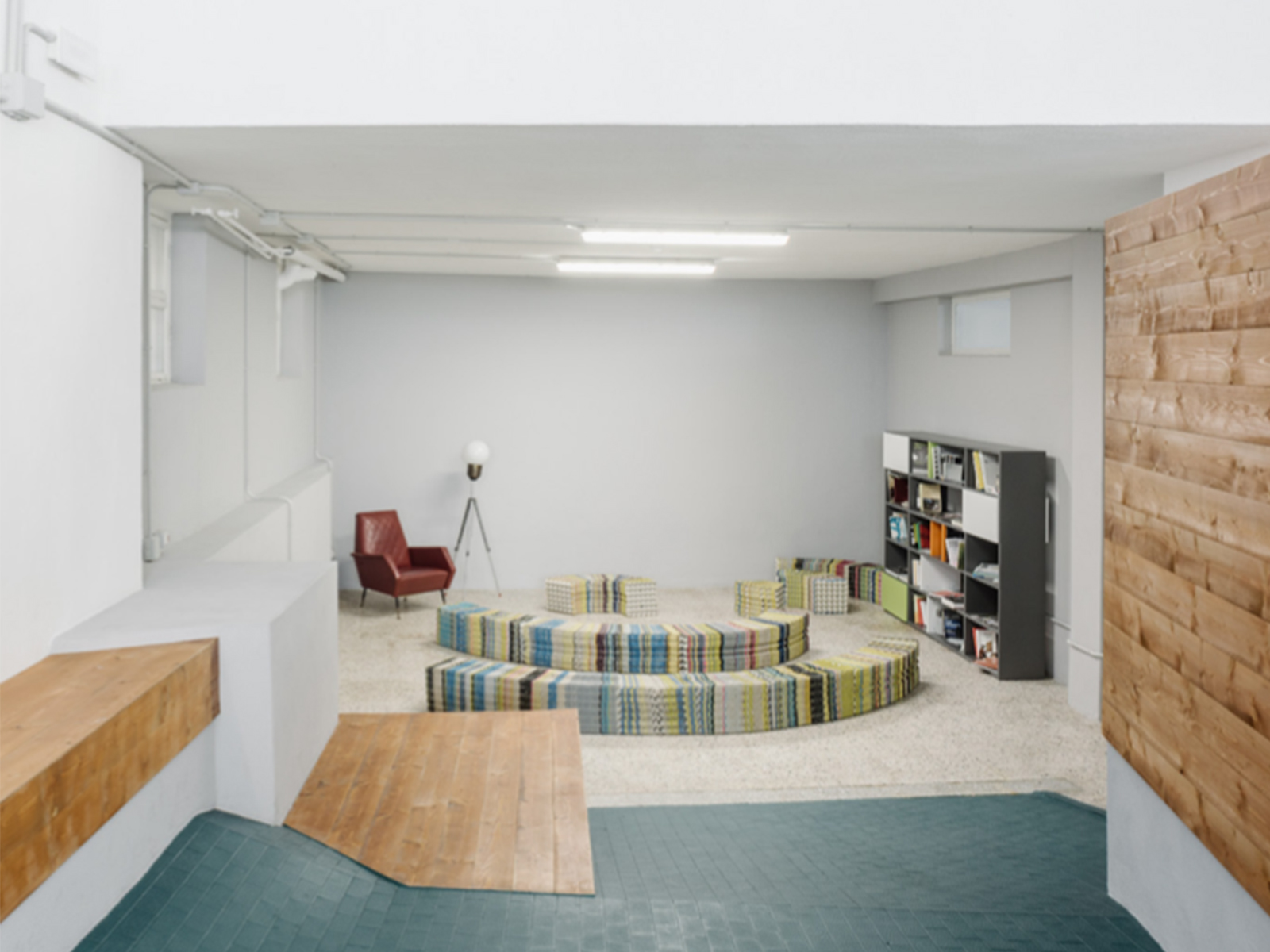 Il degrado in cui versavano gli ambienti e le grandi dimensioni degli spazi hanno portato all’elaborazione di una strategia d’intervento a bassissimo costo. Il progetto si compone di pochi elementi (i blocchi funzionali dei depositi e dei bagni, la pedana dell’accoglienza, qualche seduta e un paravento) che, posizionati ordinatamente a comporre una fascia al centro dell’ambiente, articolano lo spazio in ambiti e ne rivelano le potenzialità. La rampa d’accesso conduce direttamente al banco della reception, posizionato nel baricentro dello spazio, su cui tangono le due linee di percorso principali: una che, scandita dal ritmo irregolare dei pilastri, distribuisce la grande area di lavoro e l’area dei macchinari; l’altra, perpendicolare alla prima, che struttura un transetto ribassato, dedicato ai momenti di relax dei coworker e alle proiezioni, protetto dal paravento ligneo che fa da fondo alla reception e completato da una piccola sala riunioni separata.