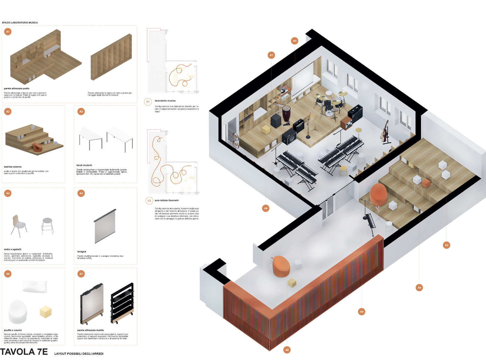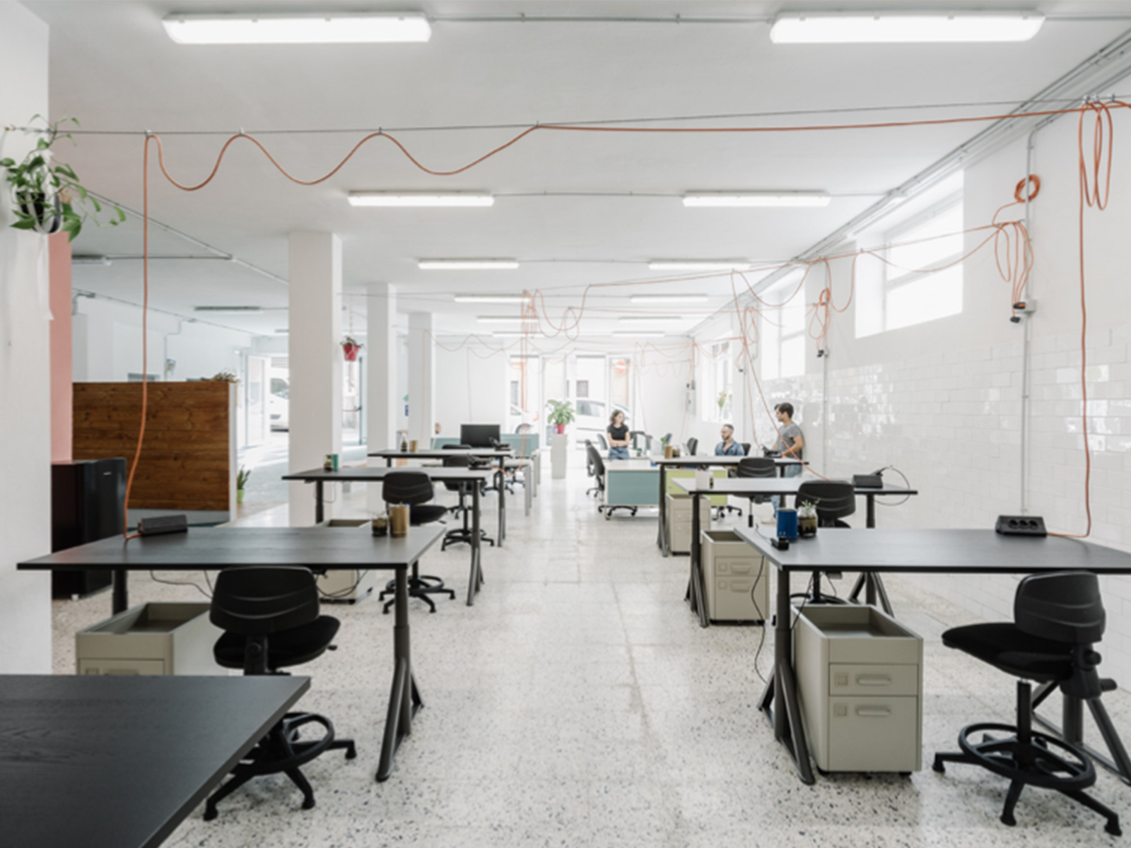 La flessibilità del grande spazio del lab, quasi isotropo, è seguita dalla definizione di un impianto elettrico libero e mobile: binari elettrificati portano cavi colorati pendenti dal soffitto che, con un sistema di piccoli carrelli, possono essere trasportati da un lato all’altro dell’ambiente.