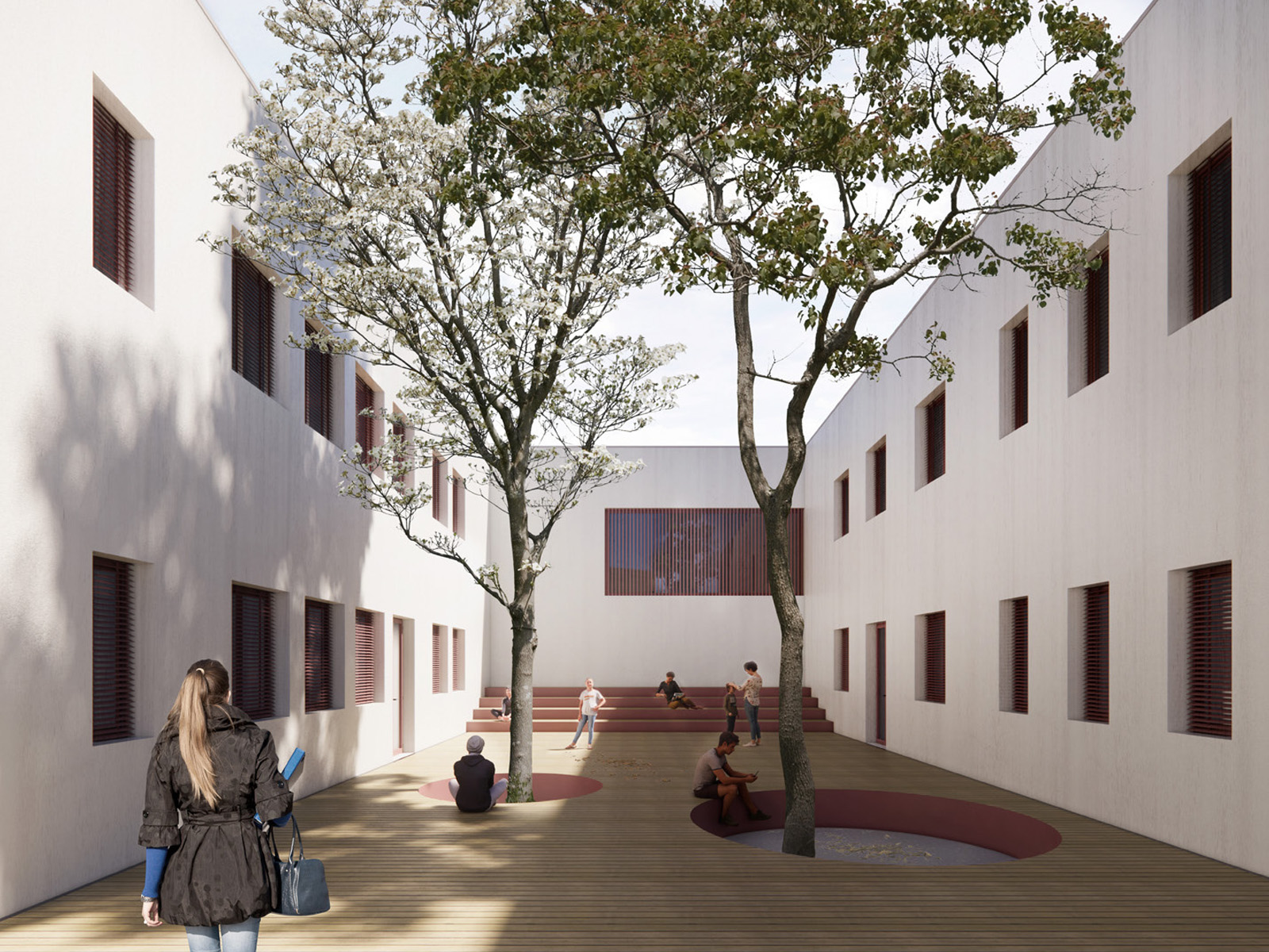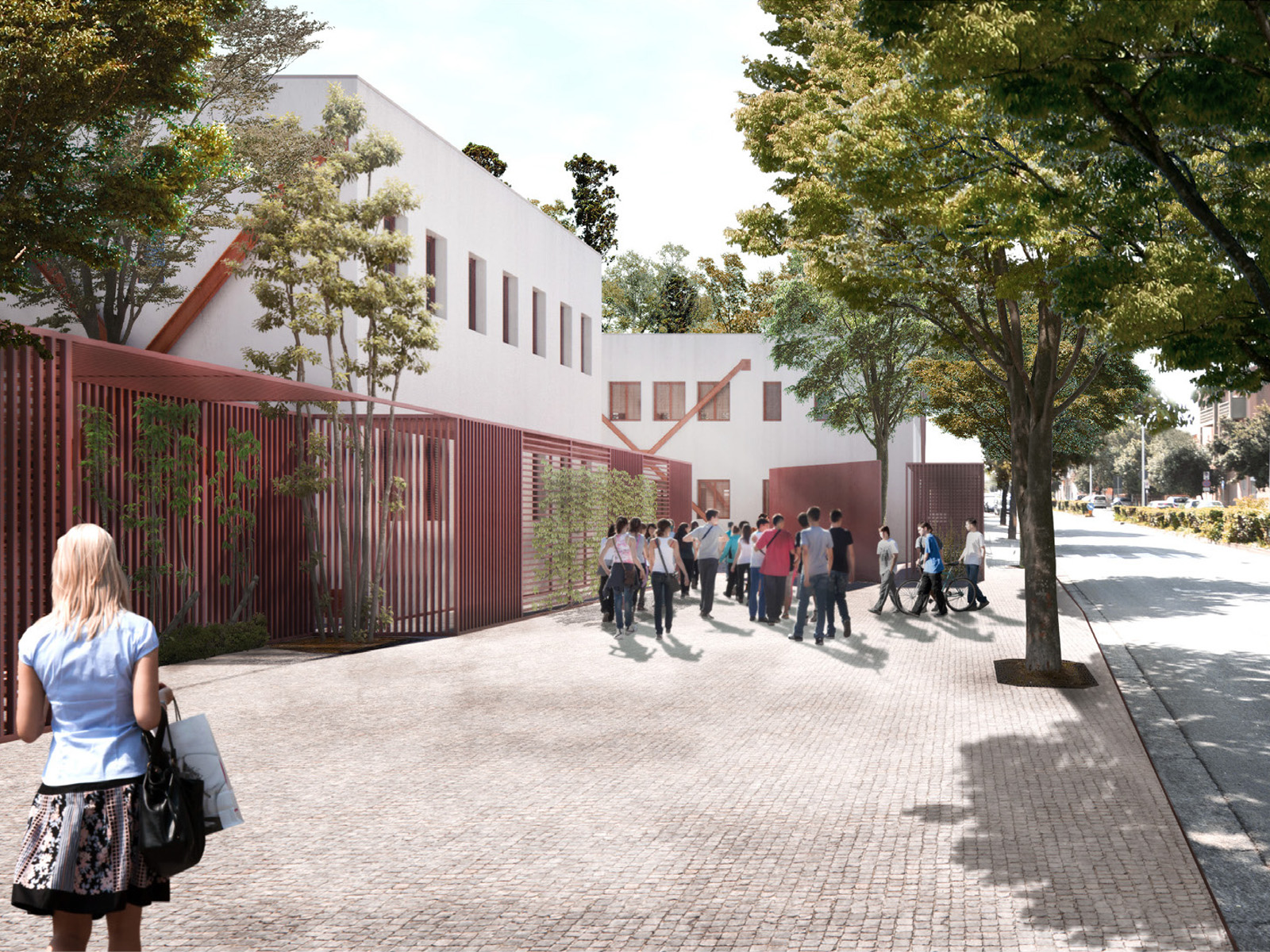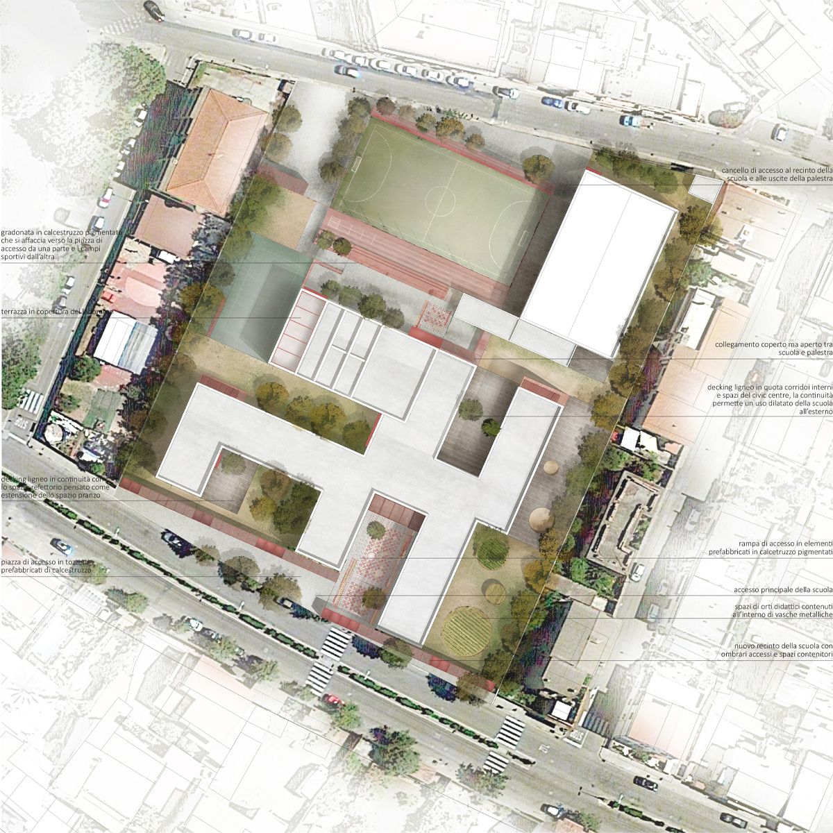 Il progetto per la Scuola Secondaria di Primo Grado Giovanni Pascoli, si prefigura su un’ampia area urbana che coinvolge spazi dalla forte vocazione pubblica tangenti all’edificio e si interfaccia con gli assi viari di Corso America e Via Sicilia, strutturati come spazi di relazione tra edificio e immediato intorno, luoghi che implementano la dotazione di spazi per la collettività.
