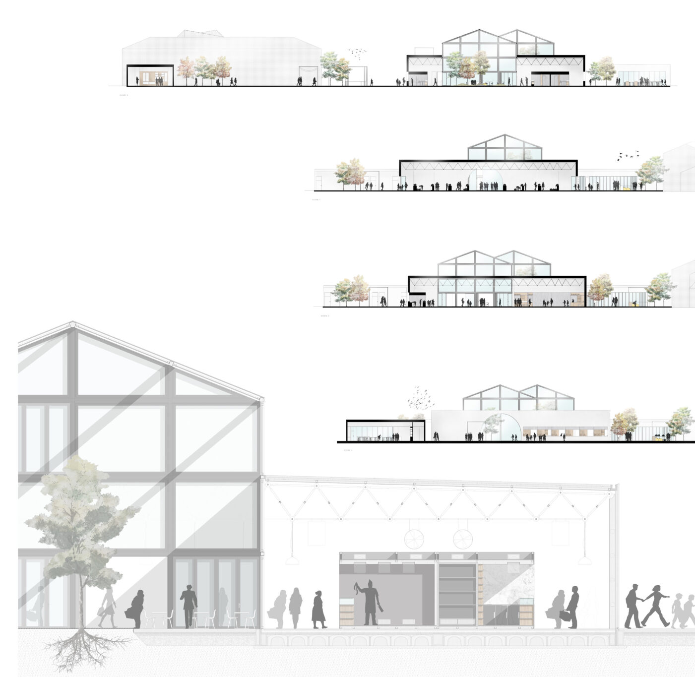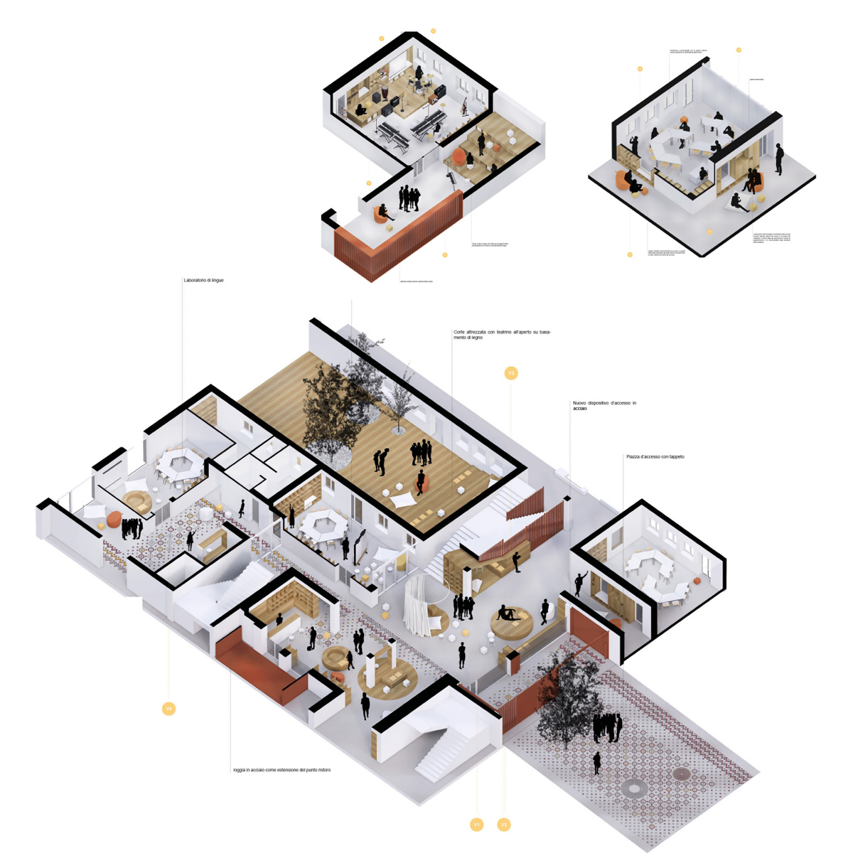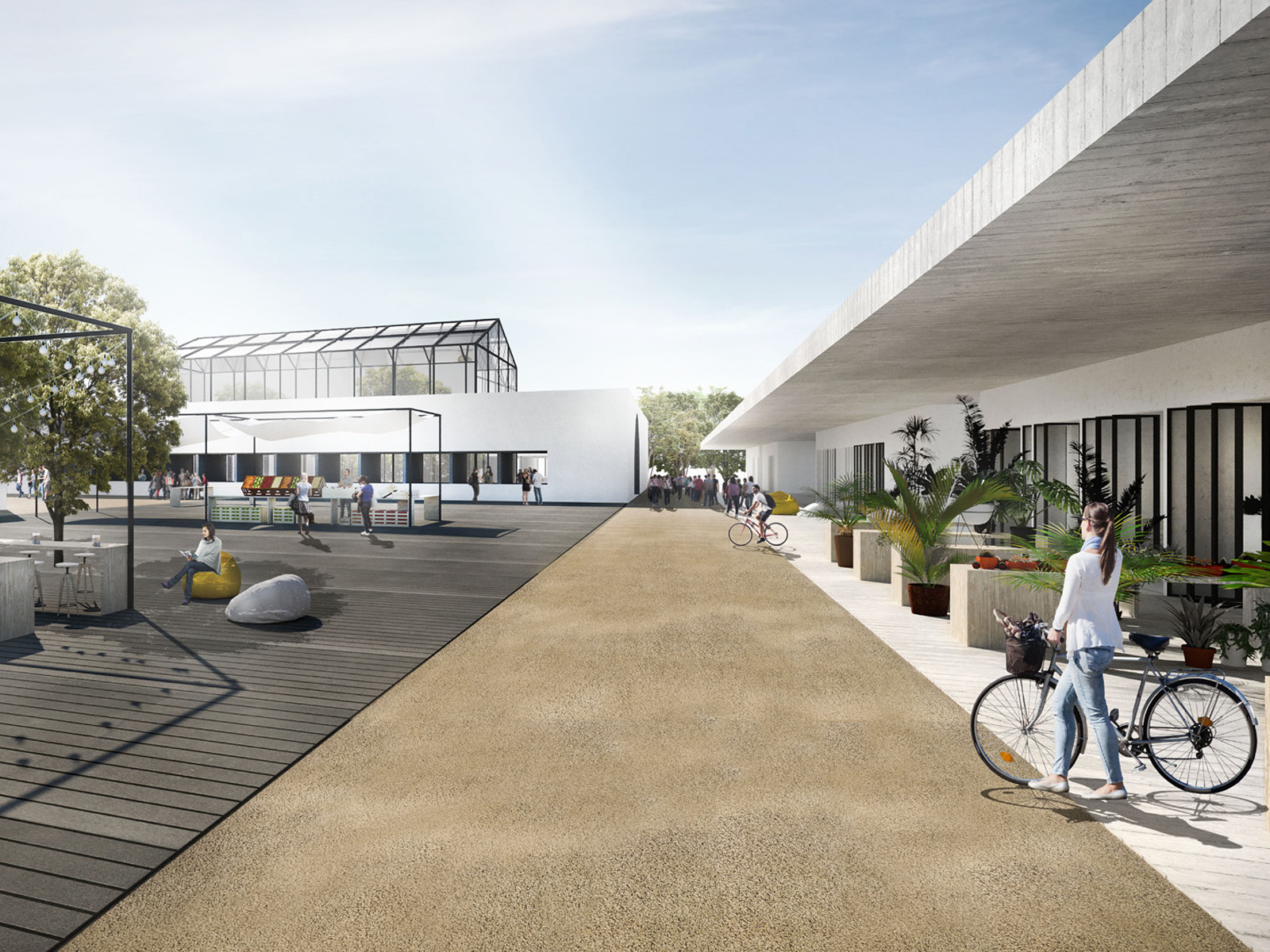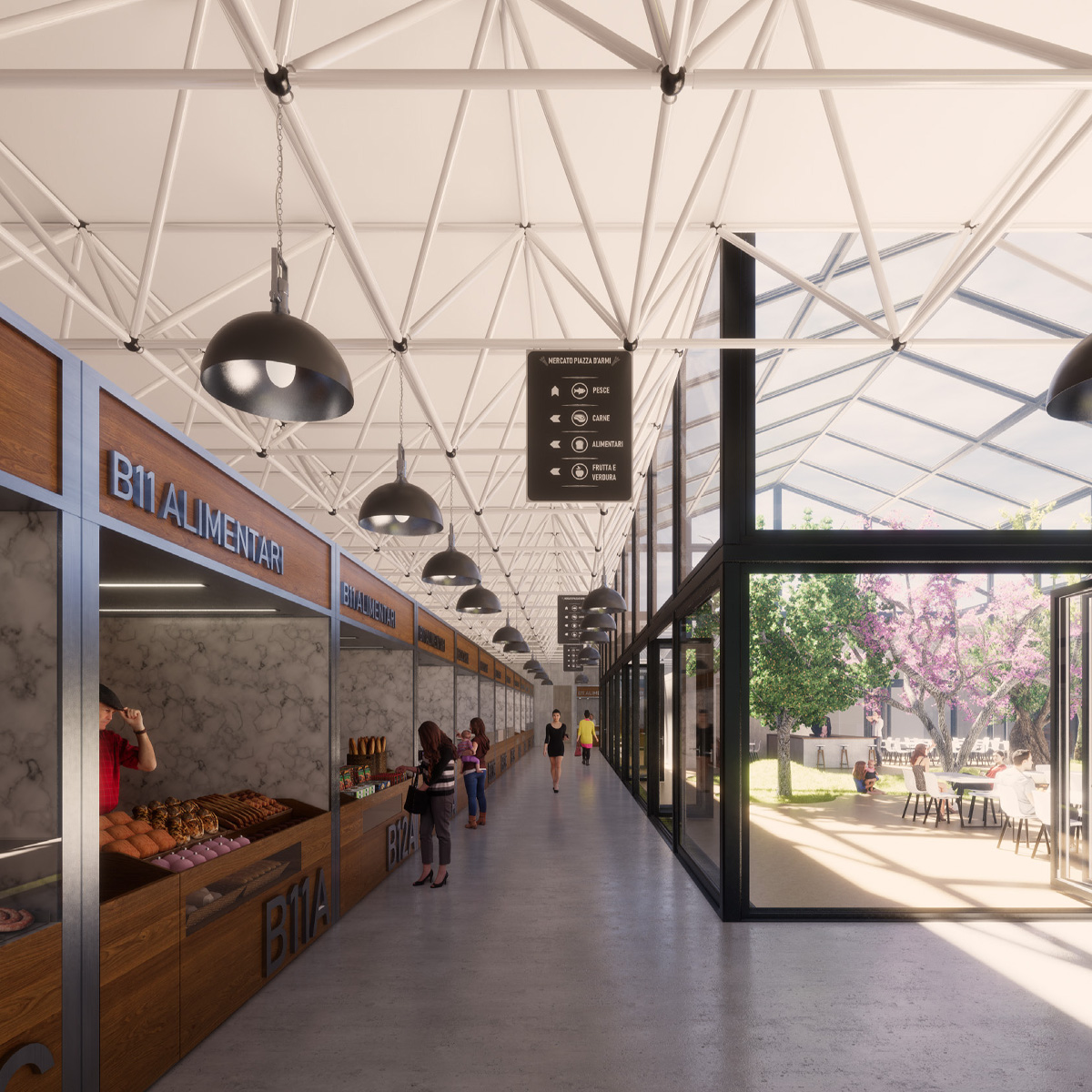 Il mercato coperto costituisce un edificio a sé, all’interno del quale i sottosistemi, ben distinti e indipendenti, sono liberamente attraversabili e fruibili, accessibili anche dall’esterno in maniera indipendente, all’occorrenza separabili gli uni dagli altri e sono dotati di spazi per le attività integrative e temporanee, oltre che di spazi di servizio dedicati. Gli spazi del mercato (al coperto e all’aperto) e gli spazi de- dicati alle attività commerciali parallele si reggono reciprocamente su un principio di genesi dicotomica, creando ed instaurando rapporti di complementarietà e promiscuità fra di loro e con lo spazio pubblico.