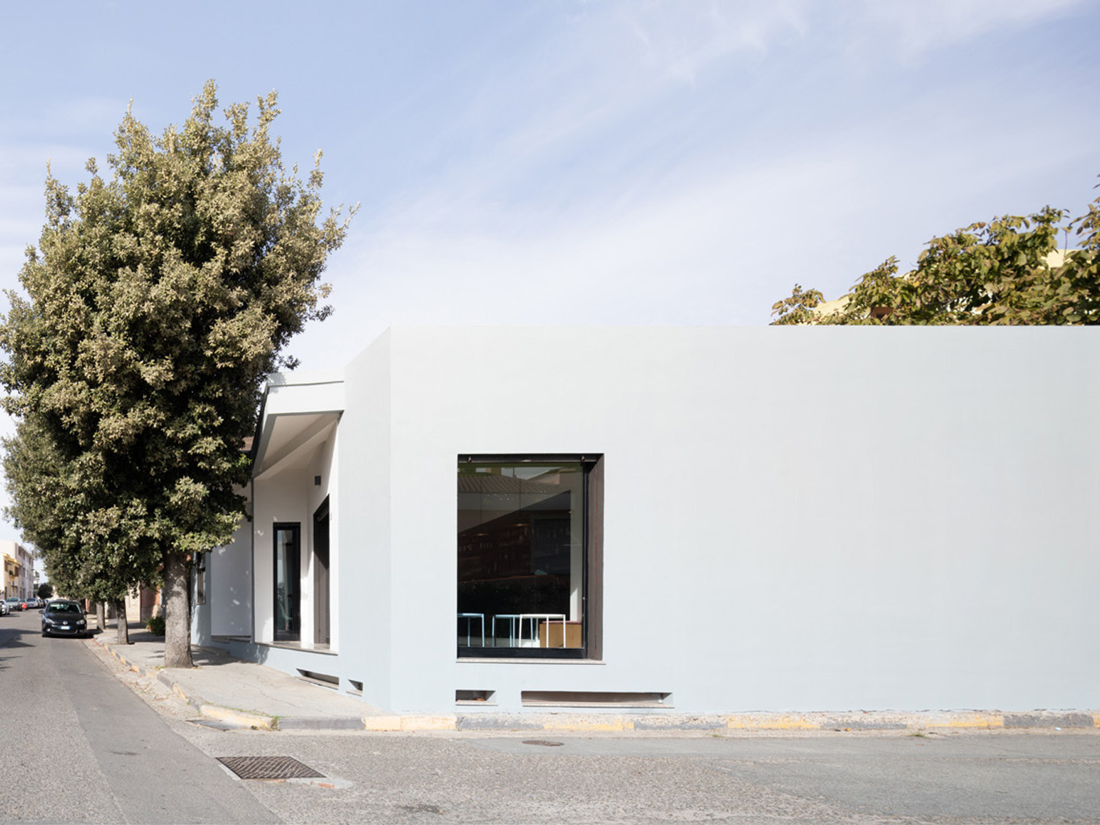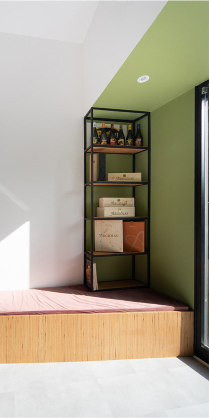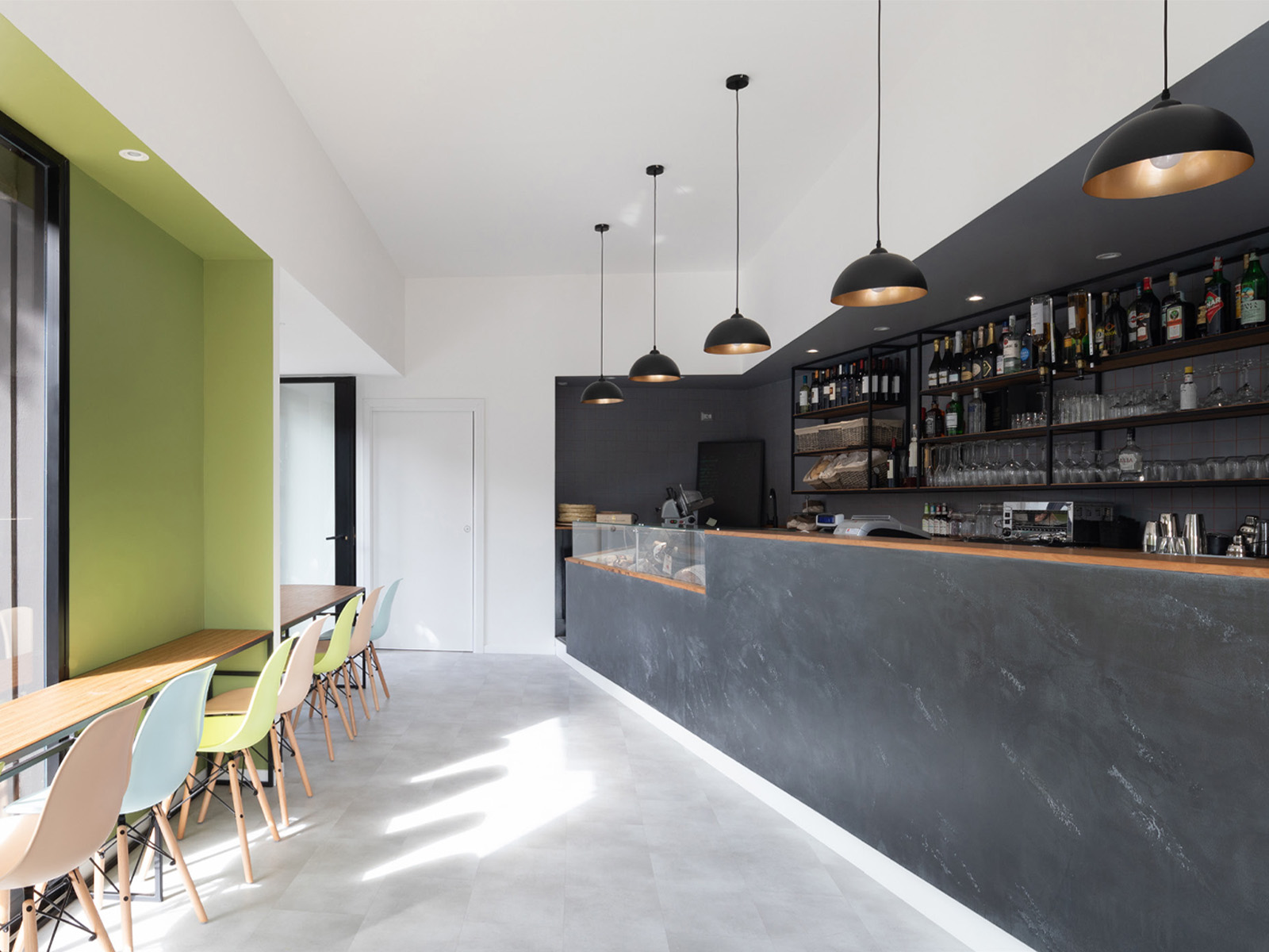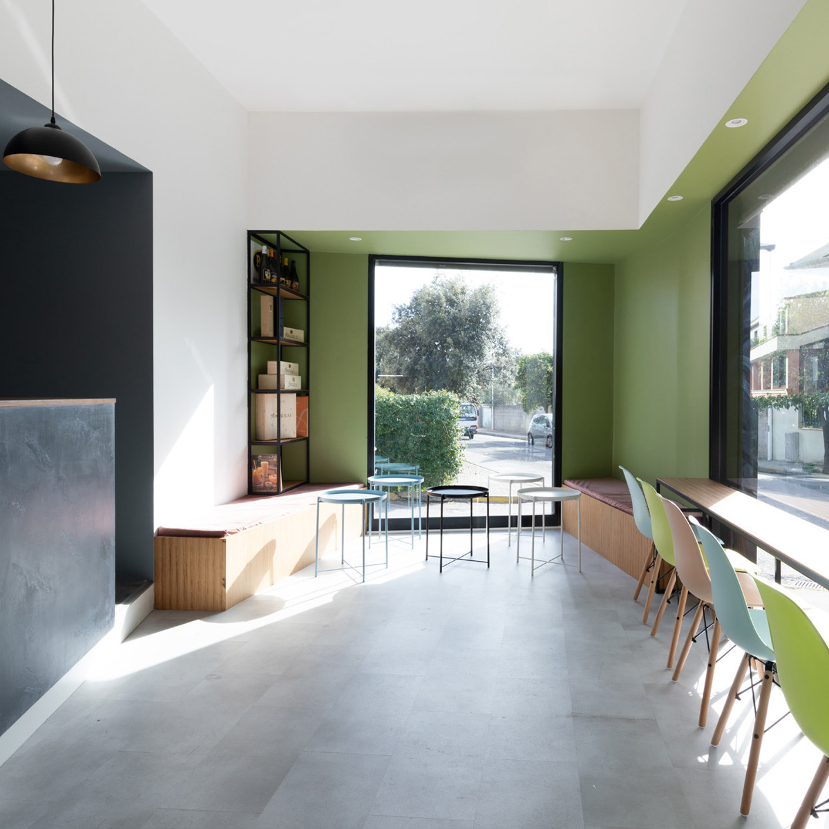 La riarticolazione interna degli spazi avviene unicamente attraverso un’unica azione compositiva: l’intersezione con la geometria irregolare dell’esistente di un rettangolo di 8mx3m, allineato al prospetto su strada. Gli scarti tra i due volumi diventano “scavi” sulle pareti di un parallelepipedo negativo virtuale il volume della sala vera e propria, definito dagli spazi serventi e dai soffitti che accolgono le sedute, i tavoli e la zona di lavoro, da cui il bancone protrude per invadere lo spazio centrale. Queste nicchie colorate, ambiti attrezzati dedicati allo stare, si rapportano confrontandosi attraverso lo spazio intermedio, bianco e neutro.