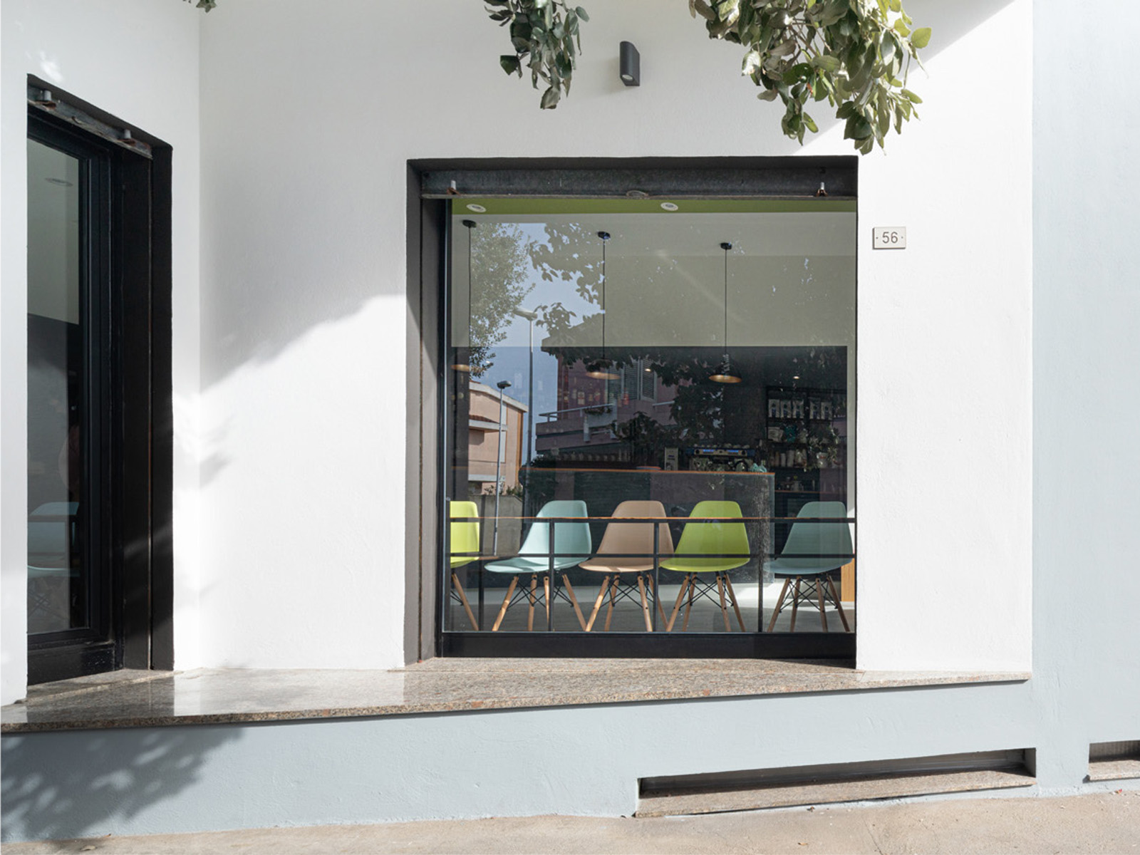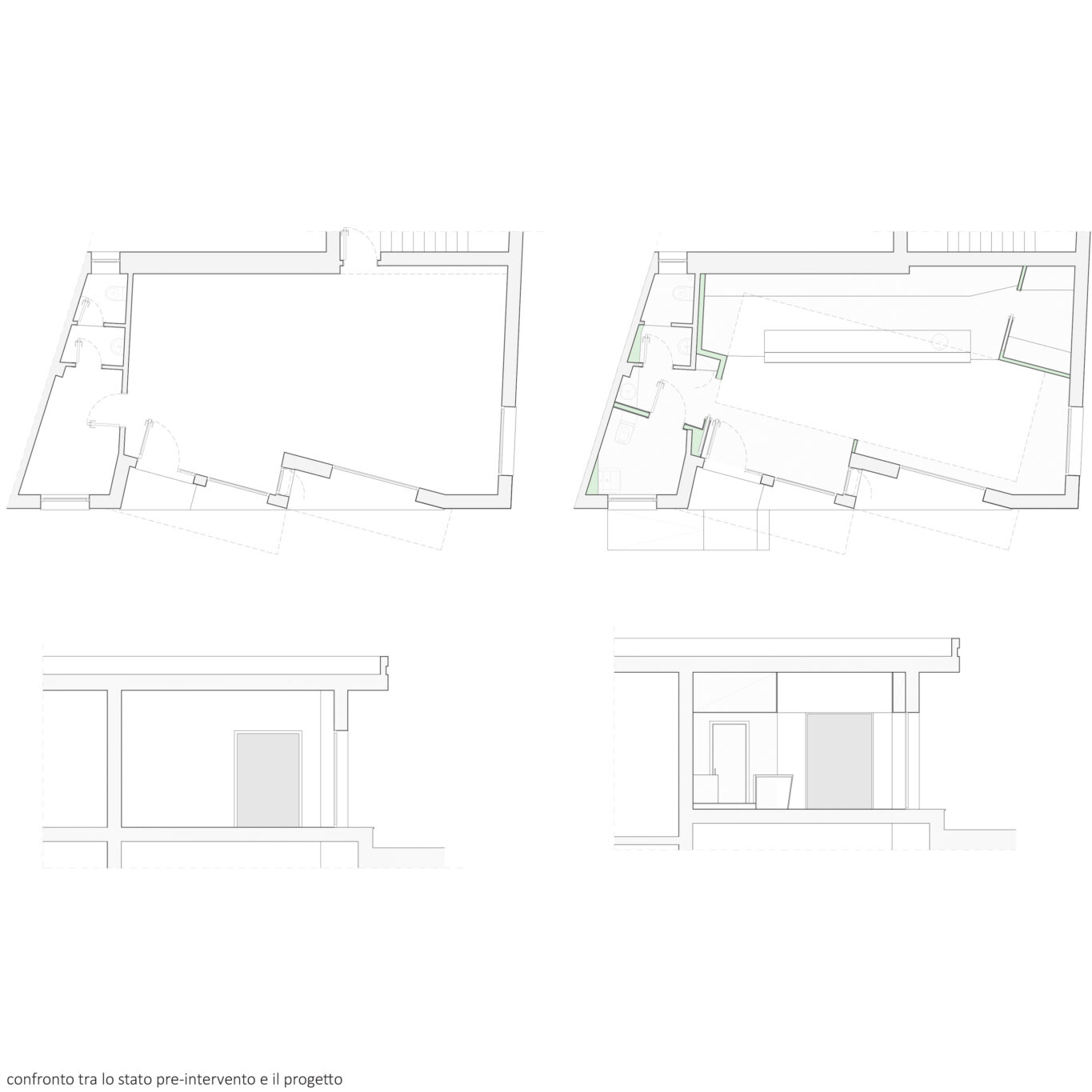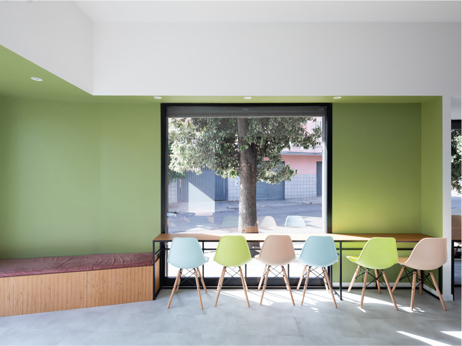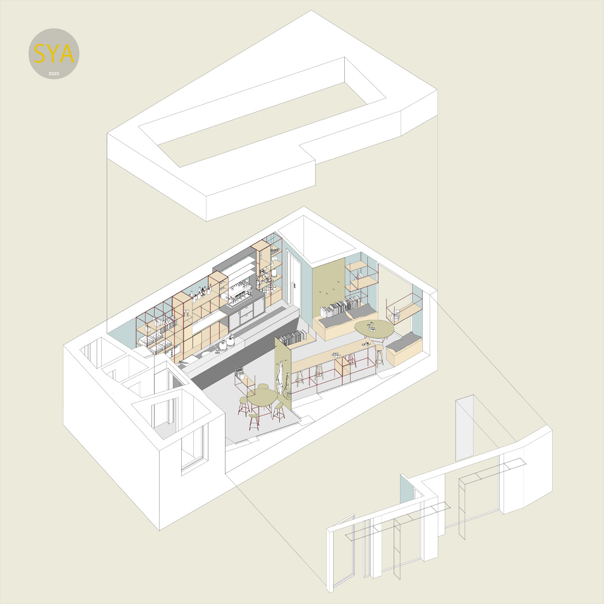 La riarticolazione interna degli spazi avviene unicamente attraverso un’unica azione compositiva: l’intersezione con la geometria irregolare dell’esistente di un rettangolo di 8mx3m, allineato al prospetto su strada. Gli scarti tra i due volumi diventano “scavi” sulle pareti di un parallelepipedo negativo virtuale il volume della sala vera e propria, definito dagli spazi serventi e dai soffitti che accolgono le sedute, i tavoli e la zona di lavoro, da cui il bancone protrude per invadere lo spazio centrale. Queste nicchie colorate, ambiti attrezzati dedicati allo stare, si rapportano confrontandosi attraverso lo spazio intermedio, bianco e neutro.