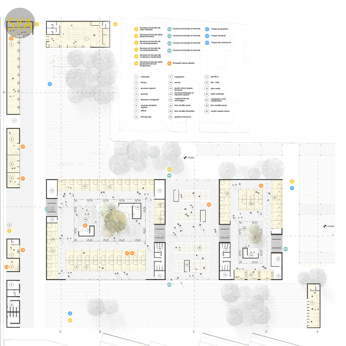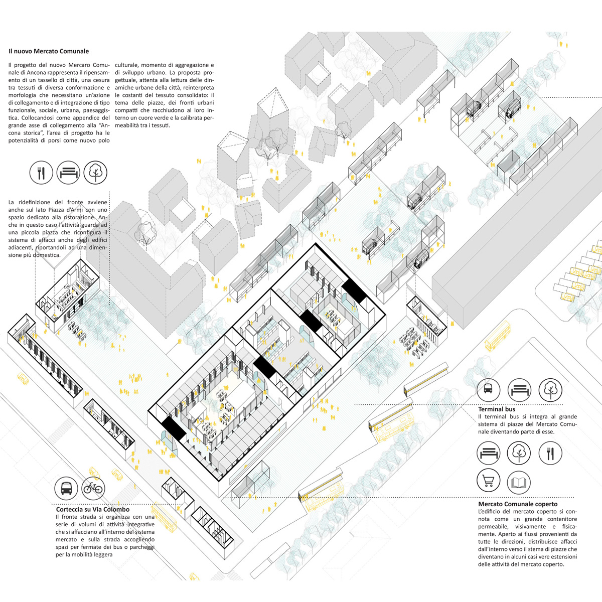 L’intervento insiste su un’area di primaria importanza per la riqualificazione del brano di città circostante, un crocevia strategico fra flussi urbani ed extraurbani, fra un bacino commerciale prettamente urbano e uno di carattere quasi extraurbano. La proposta si fonda sulla definizione di un sistema, basato sui principi urbani anconetani, in grado di costruire un tassello di città fatto di fronti, ambiti, flussi pedonali e veicolari, piazze, zone verdi e volumi che contengono le funzioni. L’organizzazione volumetrica del progetto parte da due considerazioni principali. La prima è dettata dalla differenza fra l’interfaccia di Viale Cristoforo Colombo e via della Montagnola, che nel tratto prospiciente l’area di progetto presentano rispettivamente un fronte urbano compatto e un “retro” sfrangiato. Il progetto risponde, sul lato di viale Cristoforo Colombo, con realizzando un fronte permeabile che contiene parte delle attività parallele a quelle del mercato civico e che, attraverso una grande pensilina, marca l’accesso agli spazi aperti e al grande volume del mercato civico. Sul lato di via della Montagnola il progetto si apre verso la città senza soluzione di continuità, dando luogo a una grande piazza attrezzata che connette due brani di tessuto.