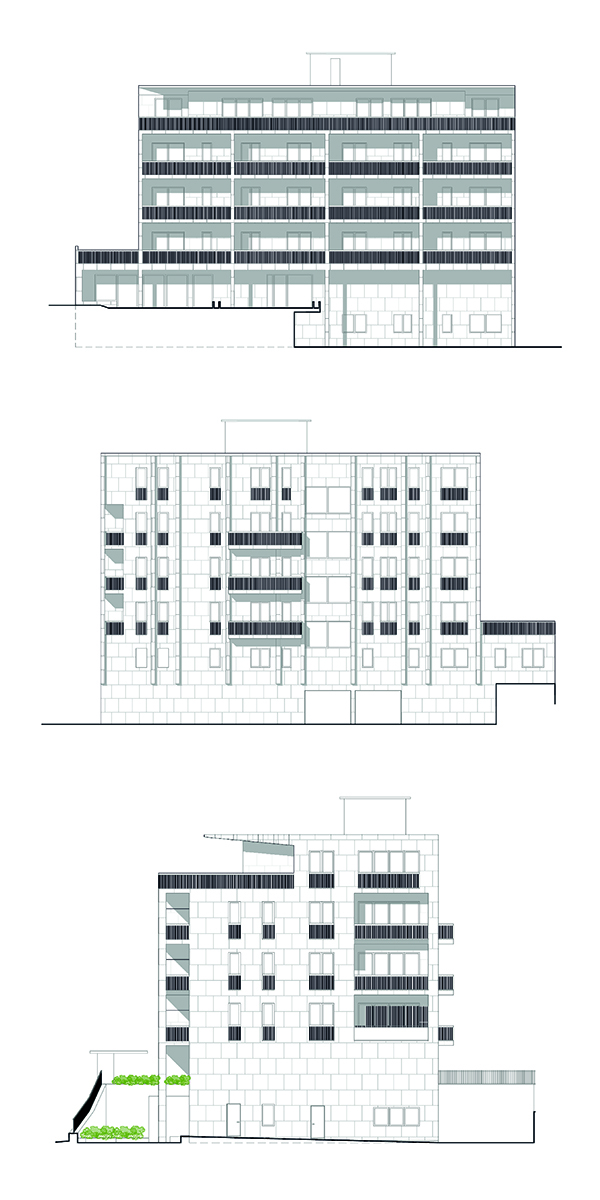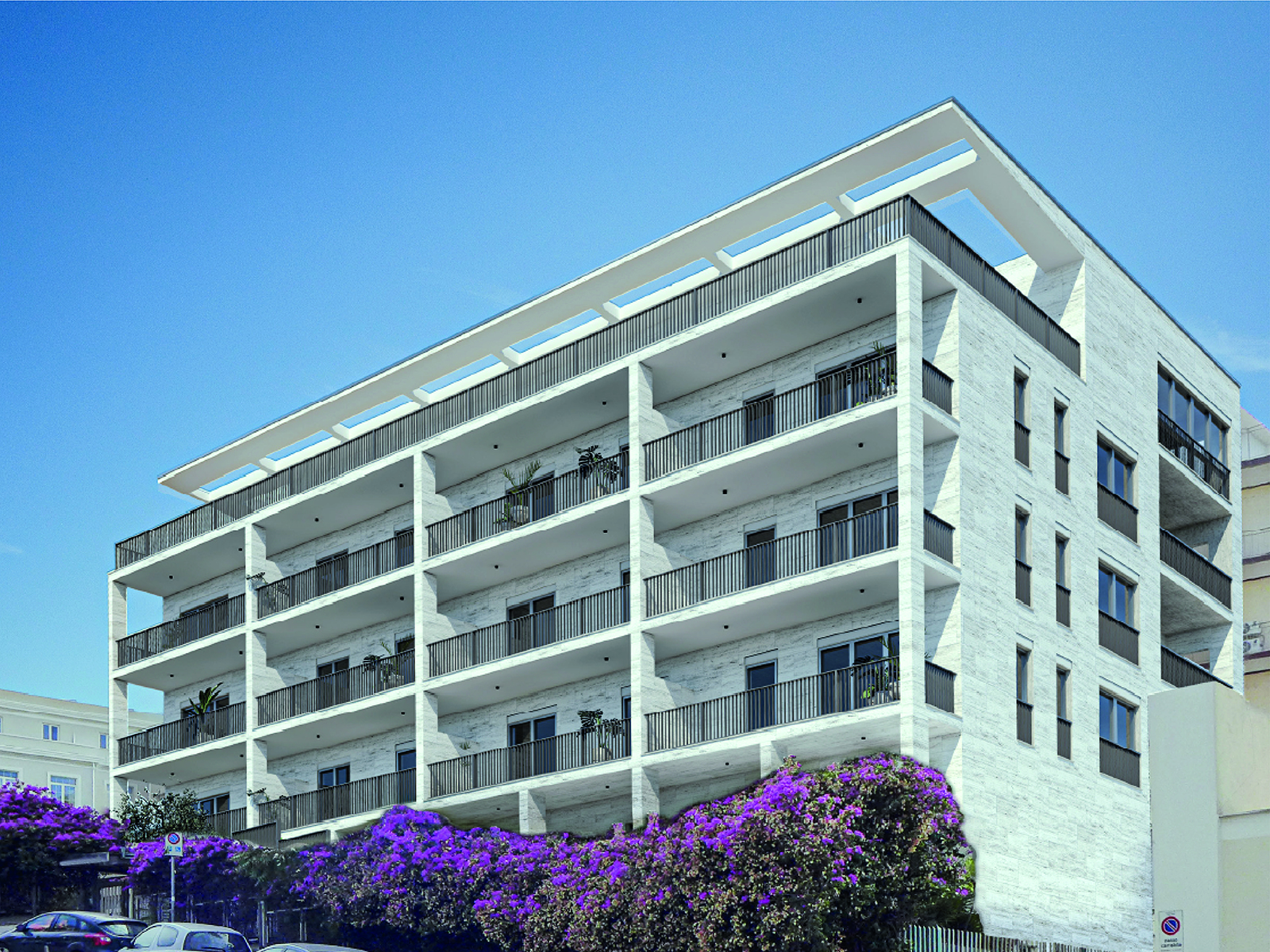 Il linguaggio dei prospetti si ispira ai criteri architettonici del razionalismo. Rivestimenti in pietra bianca, ringhiere leggere, linee semplici e decise generano un manufatto architettonico dal carattere contemporaneo ma in linea con il linguaggio del contesto in cui è inserito.