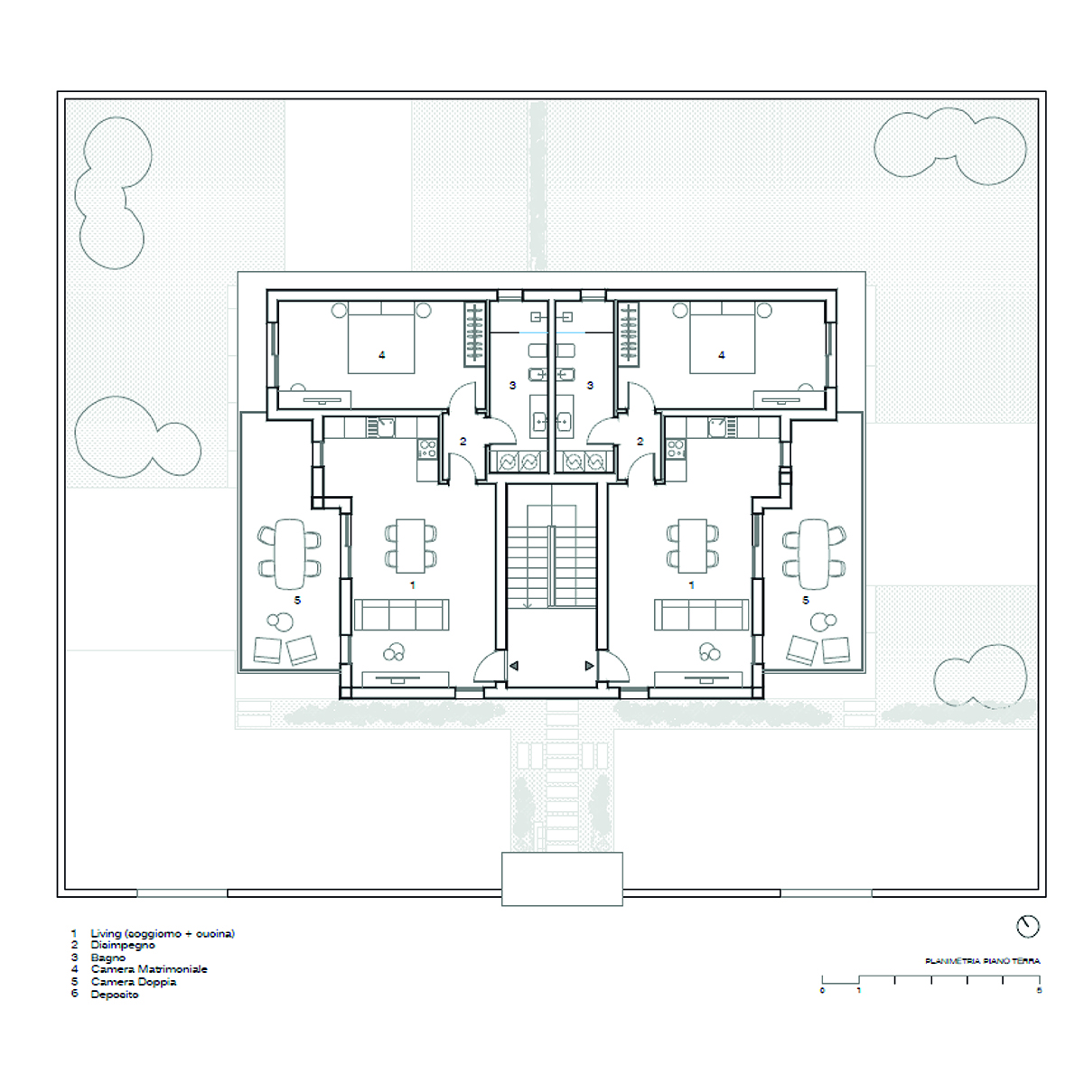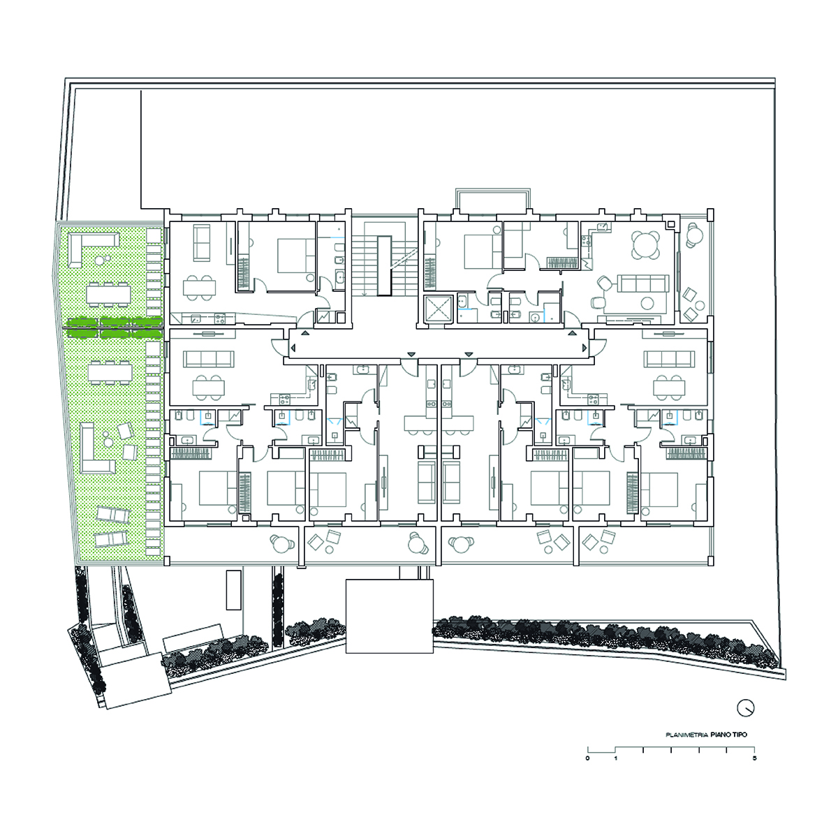 L’organizzazione distributiva, in senso verticale, prevede al piano terra una clinica oculistica, i piani superiori vengono interamente destinati ad uso residenziale. Al piano seminterrato sono invece presenti l’autorimessa della clinica, cantine e locali tecnici. Le unità residenziali si sviluppano attorno alla maglia strutturale esistente, secondo un layout di unità standard che possono essere accorpate tra loro cosi da poter soddisfare le esigenze del mercato.