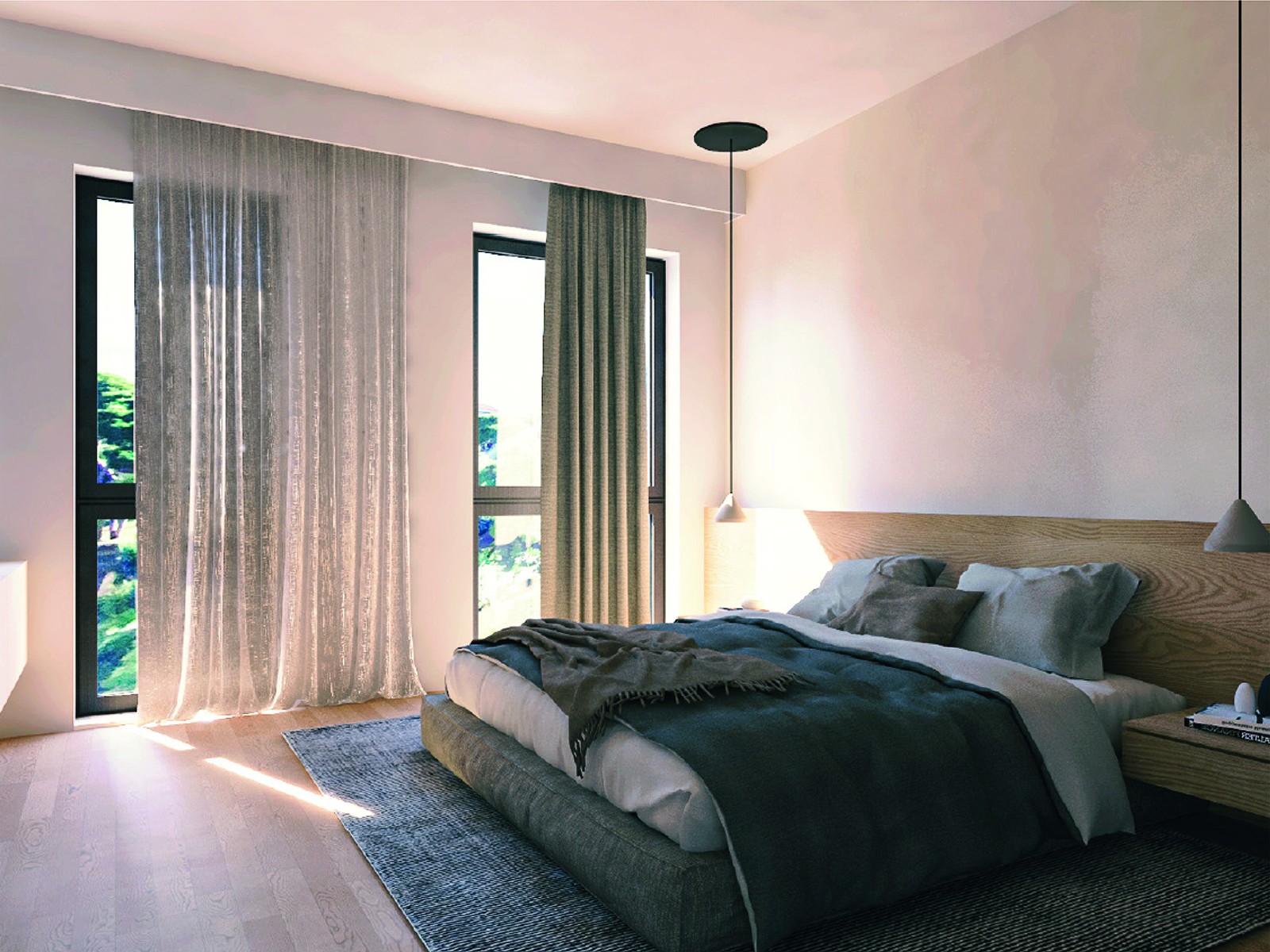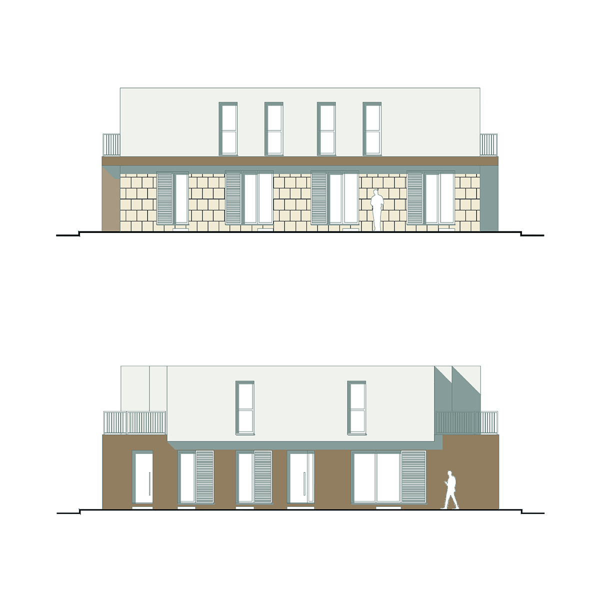 I prospetti sono caratterizzati da grandi infissi che garantiscono il soleggiamento durante l’intera giornata. L’unico fronte caratterizzato da aperture ridotte e puntuali è il fronte principale, al fine di garantire una maggiore privacy agli appartamenti del piano primo.