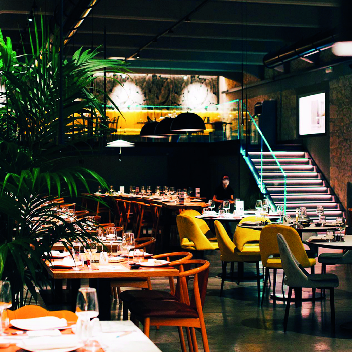 Gli ambienti delle cucine, solitamente nascosti e sacrificati, vengono invece posizionati all’entrata del locale, aperti sulla sala principale con delle vetrate a fascia che le fanno diventare un vero e proprio palcoscenico dove osservare la sottile arte della preparazione del sushi. Il tutto reso ancora più accattivante da un placcaggio a tutta altezza sui toni del giallo narciso che attira subito lo sguardo di chi entra nel locale. Il pavimento in macrocemento che corre su tutta la sala, gli inserti in legno e ferro, conferiscono un accento industriale allo spazio.