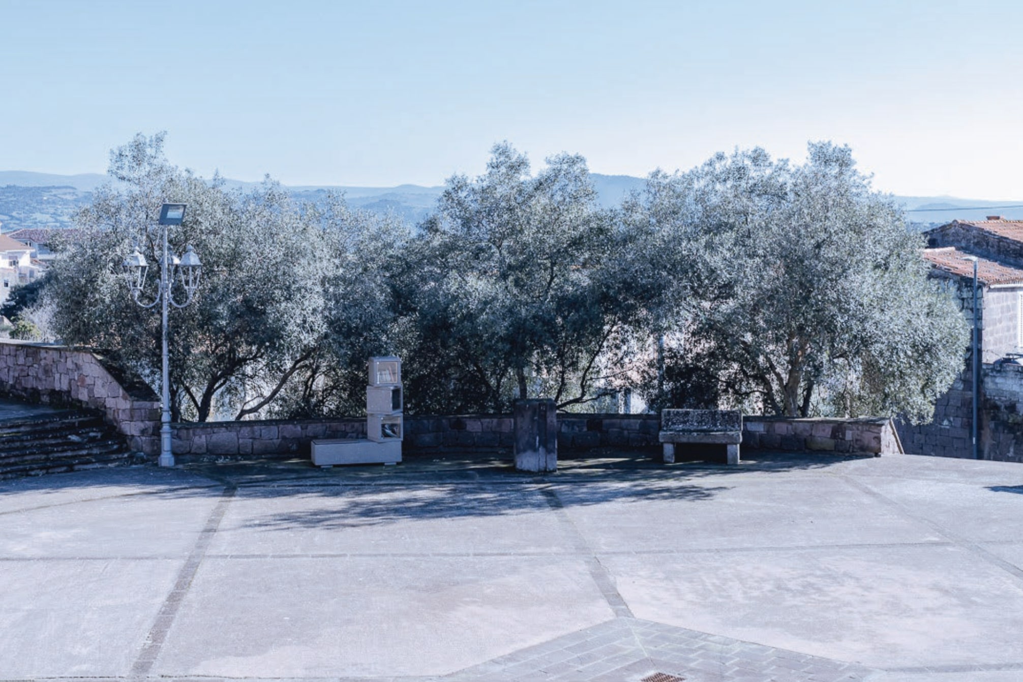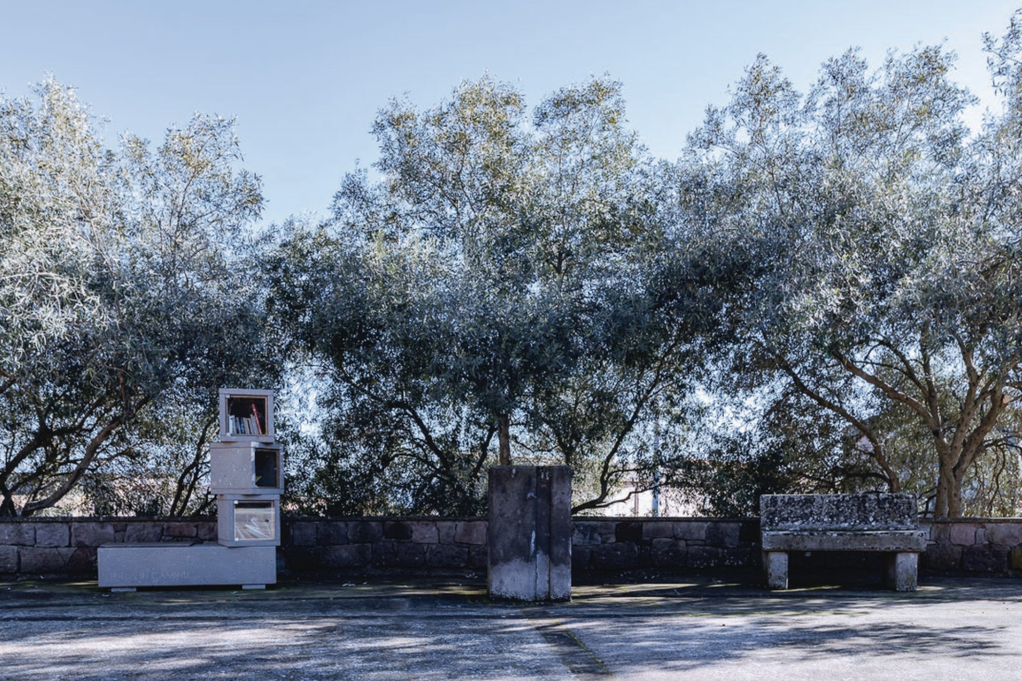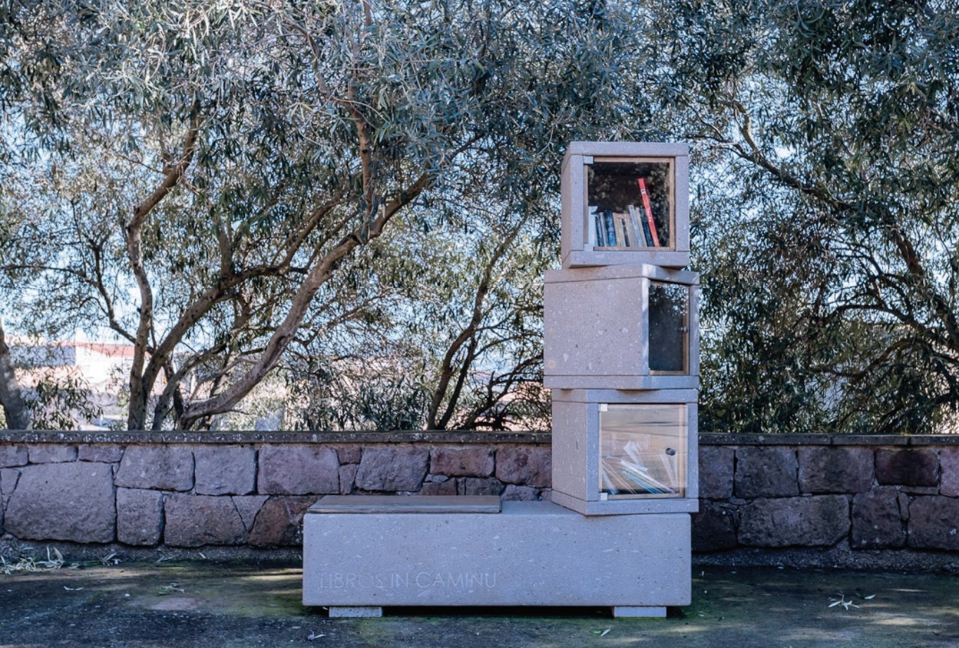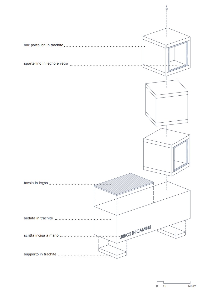 La stazione per il libero scambio di libri “Libros in caminu”, nasce dalla volontà dell’Amministrazione comunale di Ruinas di inserire il piccolo paese nel circuito del bookcrossing.La stazione, che assume generalmente la forma di “casetta” dove gli utenti possono lasciare e prendere liberamente libri, è stata invece pensata come un punto di sosta nella Piazza Grande.La stazione è stata progettata e realizzata interamente in trachite di Ruinas, con l’ausilio, e il confronto continuo, degli artigiani che gestiscono la cava locale.La particolare forma della stazione, nasce dall’unione di una seduta monolitica, come quelle tipicamente diffuse nel centro, e la sovrapposizione di scatole “contenitori” di libri.