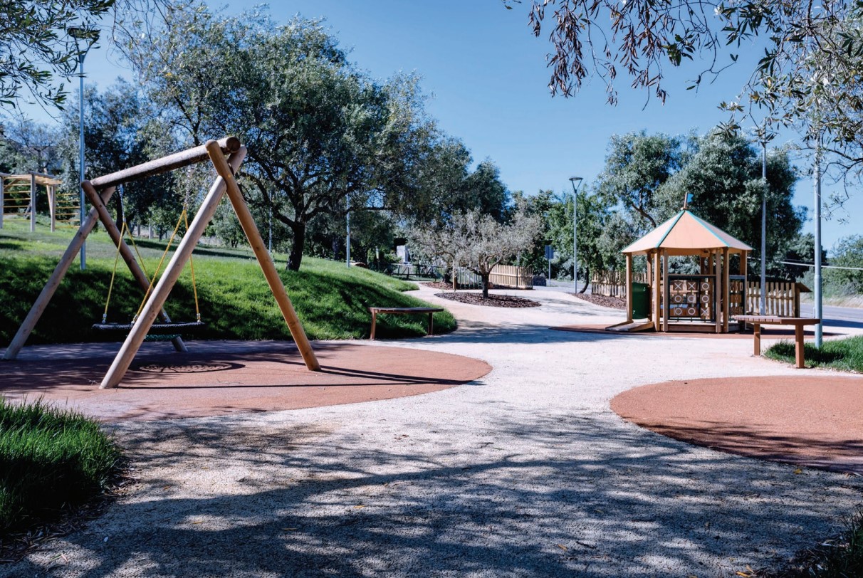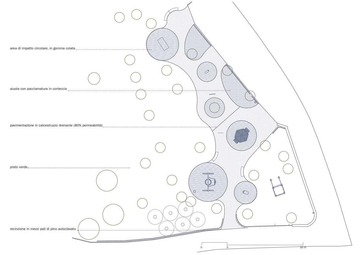 Il nuovo parco è stato pensato come un percorso omogeo e privo di ostacoli, che si snoda tra gli ulivi esistenti, i quali sono stati preservati nelle posizioni originarie.La particolare forma del parco è il risultato della duplice esigenza di preservare le preesistenze arboree e mitigare la forte pendenza esistente.Le aree pedonali sono state realizzate in calcestruzzo drenante (permeabile al 80%) e in gomma colata, per le aree di impatto dei giochi, al fine di avere una superficie omogenea priva di ostacoli.I lati del parco più esposti al traffico veicolare sono protetti da una recinzione lignea ad aria passante, realizzata in mezzi pali di legno autoclavato.