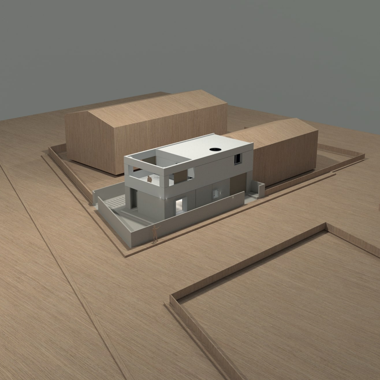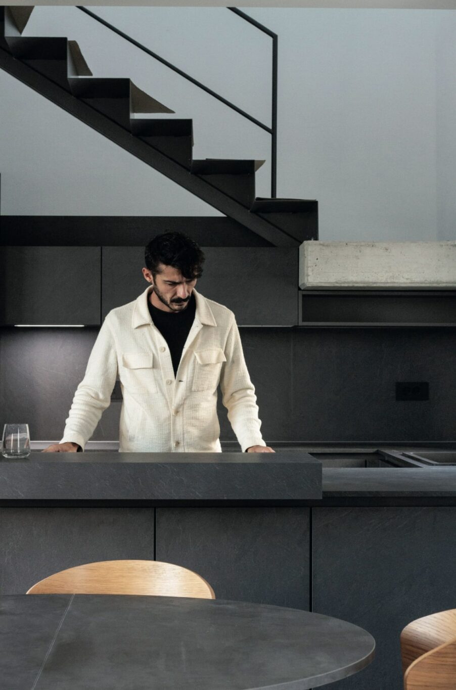 La semplicità e l’essenzialità dei clienti si riflette nella progettazione asciutta e compatta del volume: un blocco volumetrico che viene svuotato solo in occasione dell’ingresso e della terrazza padronale, alleggerendo il blocco superiore, che ospita la zona notte attraverso un cambio cromatico e di matericità, dando corpo al basamento. Le aperture a Sud Ovest vengono schermate da imbotti importanti al piano terra. Gli interni trovano il fulcro principale nel raccordo scultoreo cucina-scala.
