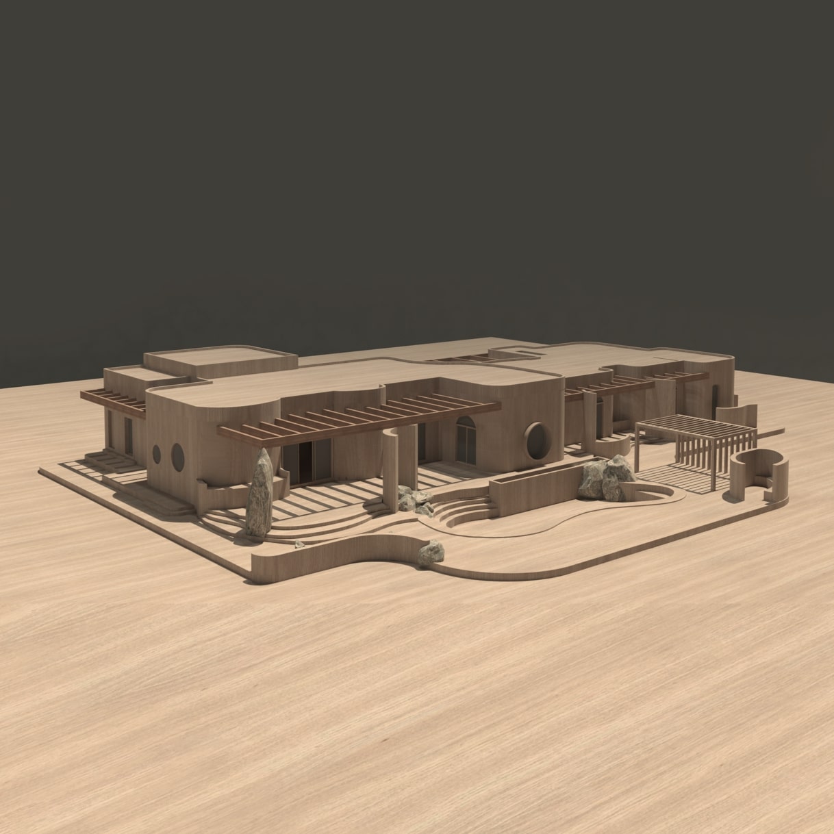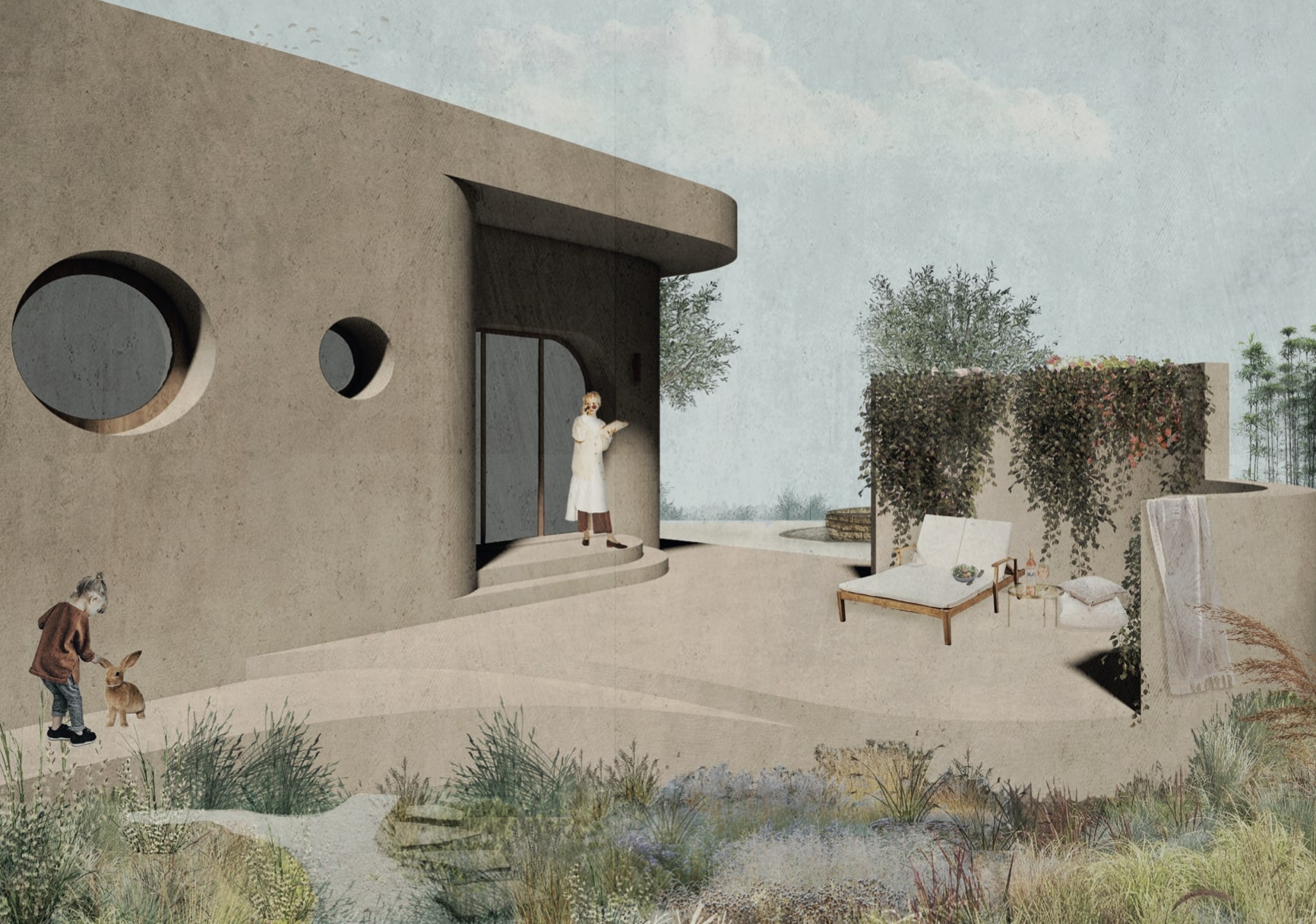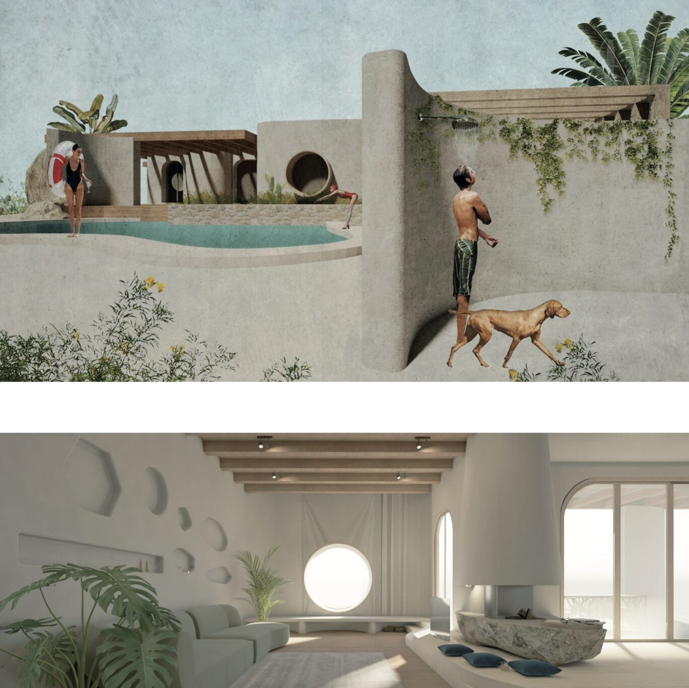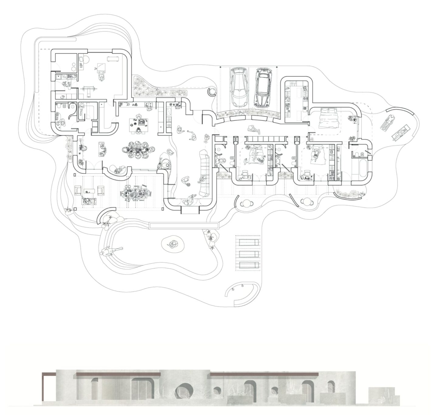 La planimetria si rifà a principi di progettazione organica che cercano nel raccordo delle pareti e nelle aperture circolari un senso di infinito e continuità visiva. Un’ampia zona giorno trova il fulcro nel focolare domestico e si sviluppa articolando camere e bagni nella zona est.