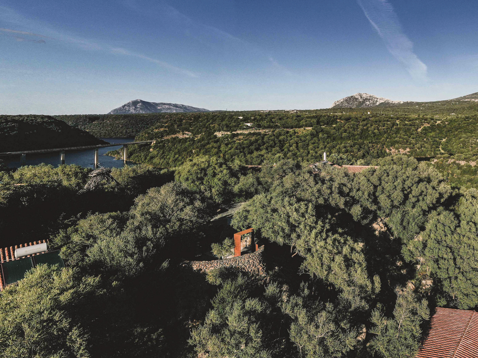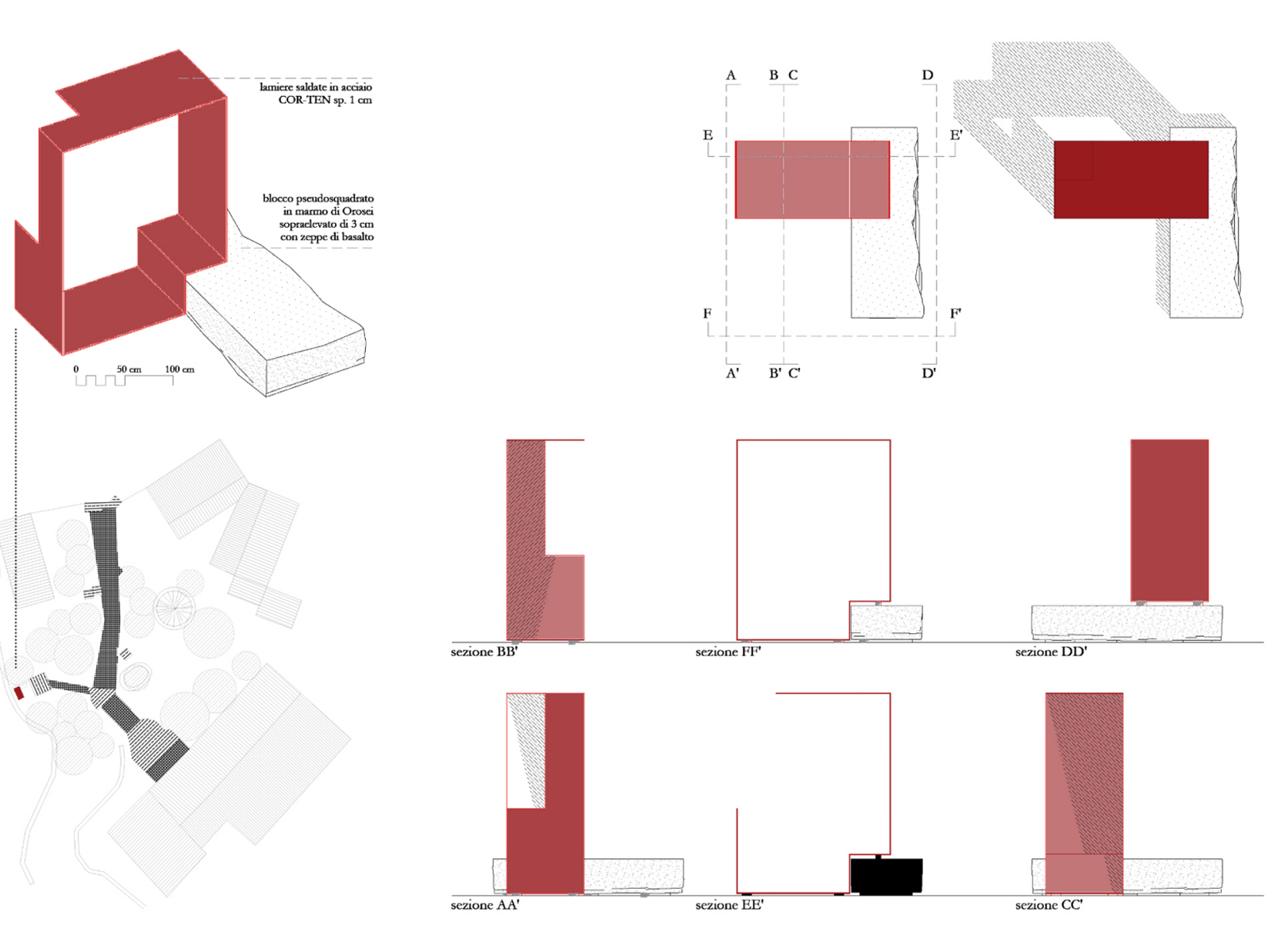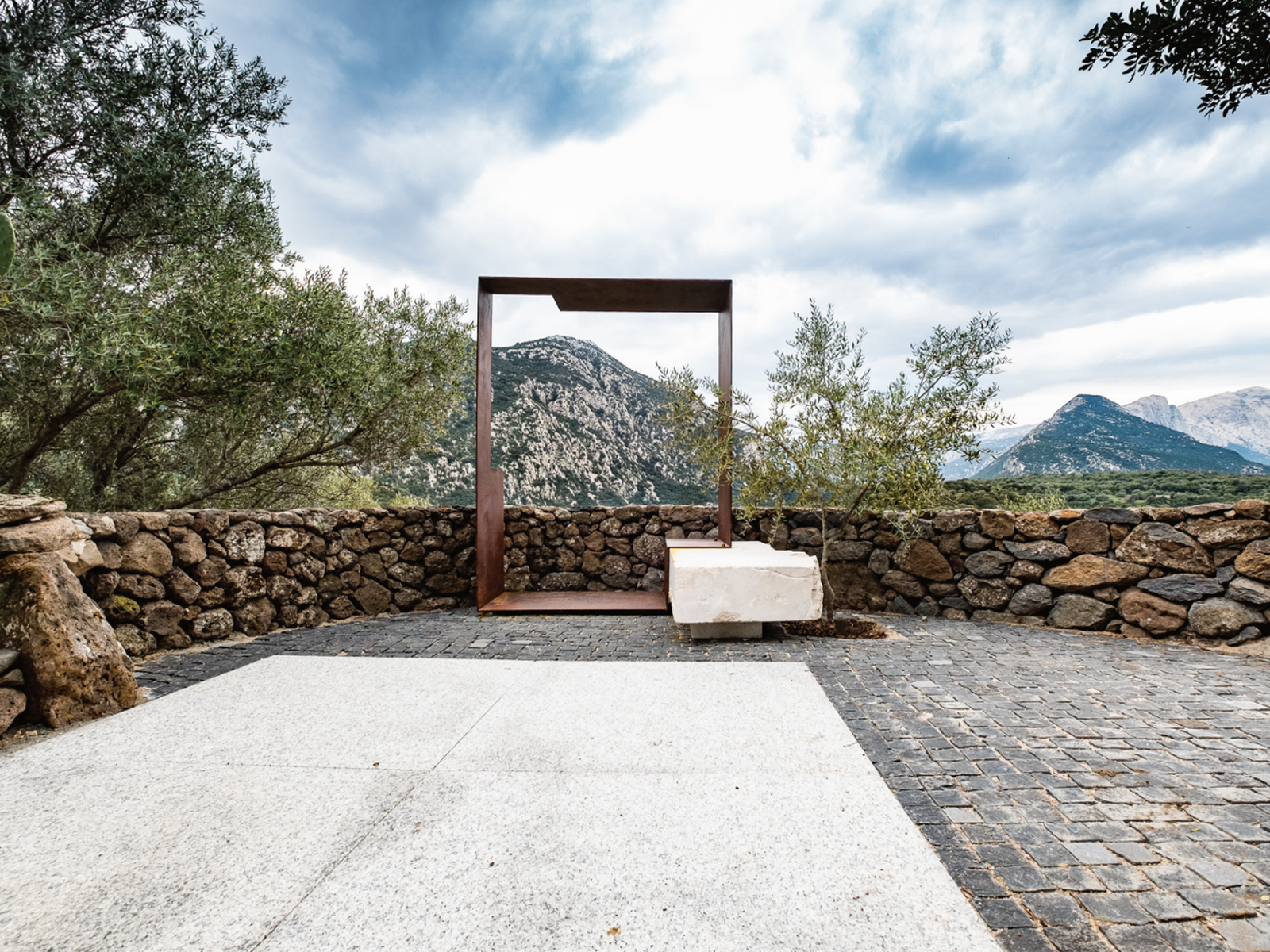 L’intervento consiste nel ripensamento degli spazi esterni dell’Agriturismo Canales, situato ai bordi della scarpata basaltica del Cedrino, a Dorgali (Sardegna, Italia); Le scelte progettuali hanno origine nella consapevolezza di una forte necessità di qualità per il progetto nei contesti rurali dell’isola. Una qualità che si cerca di tradurre in forme costruite, reinterpretando i principi e i caratteri di quell’abitare minimo che ha costruito nel tempo il paesaggio a bassa densità dell’isola. Questi principi-temi trovano la loro costruzione formale nell’individuazione di una strada-mosaico che gerarchizza lo spazio informale tra gli edifici dell’agriturismo e accenna, tramite scarti e piastre, alle soglie che la mettono in relazione con le diverse aree del sito. Una serie di elementi puntuali, come la cornice-belvedere e la pergola, individuano dei nodi salienti del sistema, legati all’apertura visiva verso il panorama del Supramonte. I materiali costitutivi del progetto reinterpretano la complessità morfologica locale, mettendo in campo, letteralmente, elementi in basalto, granito, calcare e laterizio, tessuti secondo trame modulari a formare un ‘tappeto litico’ nella soglia dell’edificio principale. Gli oggetti dello stare invece, la cornice e la pergola, sono realizzati in acciaio patinato, a richiamare l’atemporalità dell’oggetto tecnico che nella ruralità si confronta con l’organicità lapidea della sistemazione della quota zero.)
