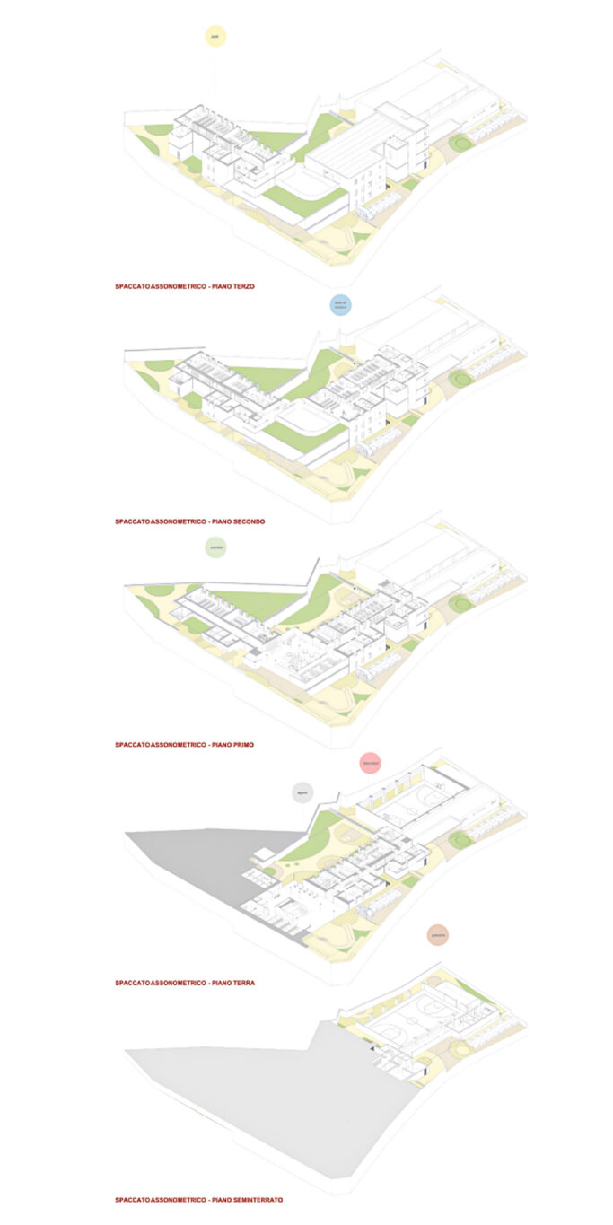 I blocchi di unione vengono posizionati con un sapiente gioco di altezze facendo coincidere i livelli tra i fabbricati esistenti e garantendo una continuità di flussi. L’alternanza materica tra la pienezza/pesantezza dell’esistente con l’opacità/trasparenza del nuovo si lega anche alle funzioni che gli edifici contengono: quelle più private scolastiche nei blocchi intonacati, quelle più pubbliche di agorà, biblioteca, spazi polifunzionali nei blocchi rivestiti di policarbonato, dai quali scaturisce l’effetto ricercato di lanterna cittadina a simboleggiare un nuovo cuore pulsante nel paese. Internamente, gli spazi della scuola, per quanto consentito dalle strutture esistenti, sono pensati come modulari e flessibili, facilmente configurabili e in grado di rispondere a contesti educativi sempre diversi, secondo sistemi di insegnamento e apprendimento più avanzati.