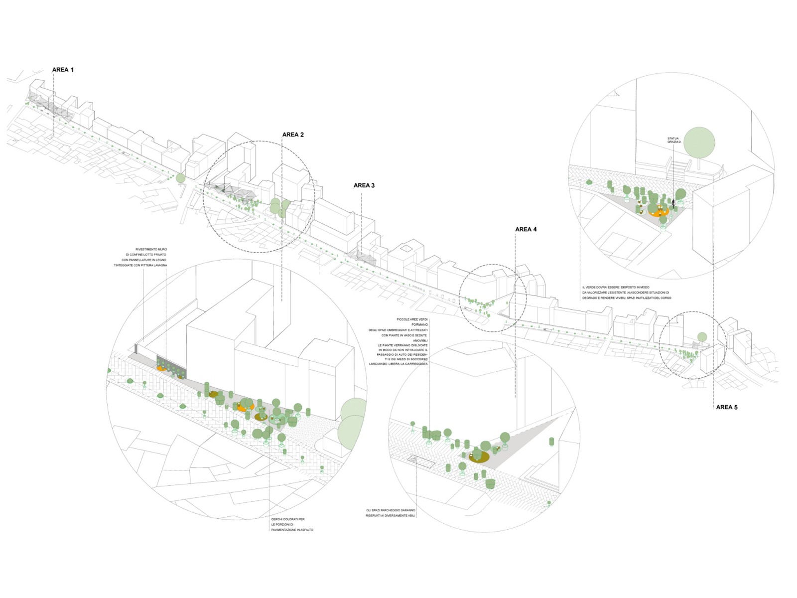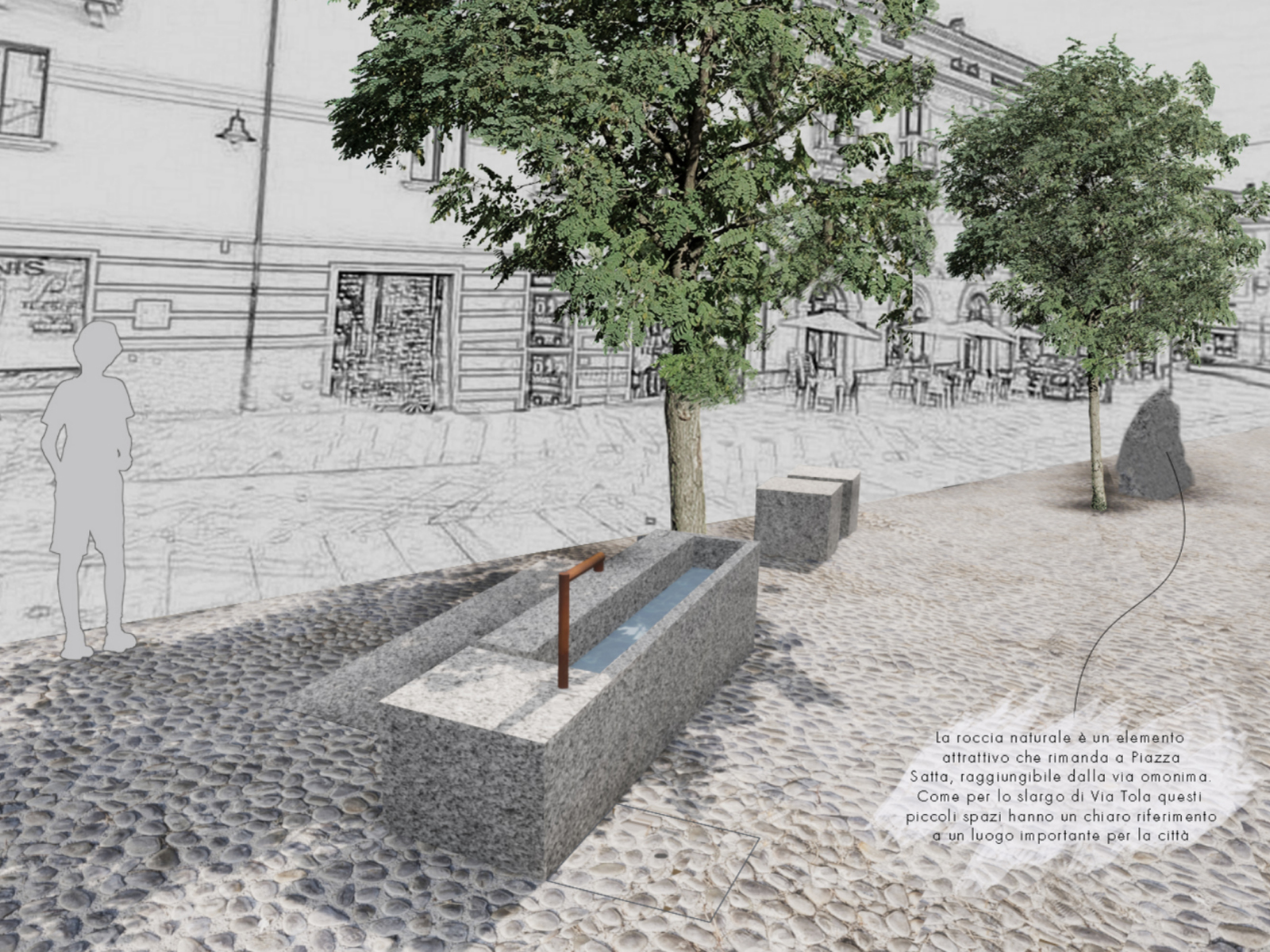 Il progetto si configura come il primo di una serie di interventi mirati alla riqualificazione complessiva della Via storica più importante della città di Nuoro. Tali interventi sono la conseguenza di un progetto sperimentale iniziato nel 2020 che ha visto il concretizzarsi della pedonalizzazione della Via attraverso opere di allestimento temporaneo come piante e arbusti in vaso, sedute amovibili e arredi interattivi. Questo processo di sperimentazione ha visto la graduale accettazione del progetto nascente da parte della comunità con la quale si è innescato un dialogo e una condivisione ancora oggi in divenire. Durante tale periodo è stato possibile identificare criticità e potenzialità della Via, ponendo le basi per lo sviluppo di un successivo progetto strategico di riqualificazione. Dando seguito alla fase di sperimentazione, lo studio ha redatto un Progetto generale di riqualificazione dell’area che si articola in microinterventi volti alla trasformazione di tre slarghi e dell’intero arredo urbano. Primo in ordine temporale è stato l’intervento di riqualificazione dello slargo di testata del Corso Garibaldi all’incrocio con la Via Tola. Le lavorazioni aventi la funzione di trasformare lo slargo nel tempo adibito a parcheggio hanno consentito di rimettere in luce il ciottolato storico coperto nel corso degli anni da strati bituminosi. Nella piazza appaiono elementi nuovi come tre alberature ad alto fusto piantumate a terra ed elementi di arredo in granito (pietra locale) che riprendono la matericità di altre piazze presenti nella Città. Il secondo intervento affidatoci e attualmente in fase d’appalto riprende i tematismi del precedente mettendo in luce il ciottolato storico e inserendo nuovi arredi (fontane e sedute) che con un linguaggio moderno entrano in intima relazione con il sito creando uno spazio di sosta e di relazione nella lunga passeggiata del Corso Garibaldi.