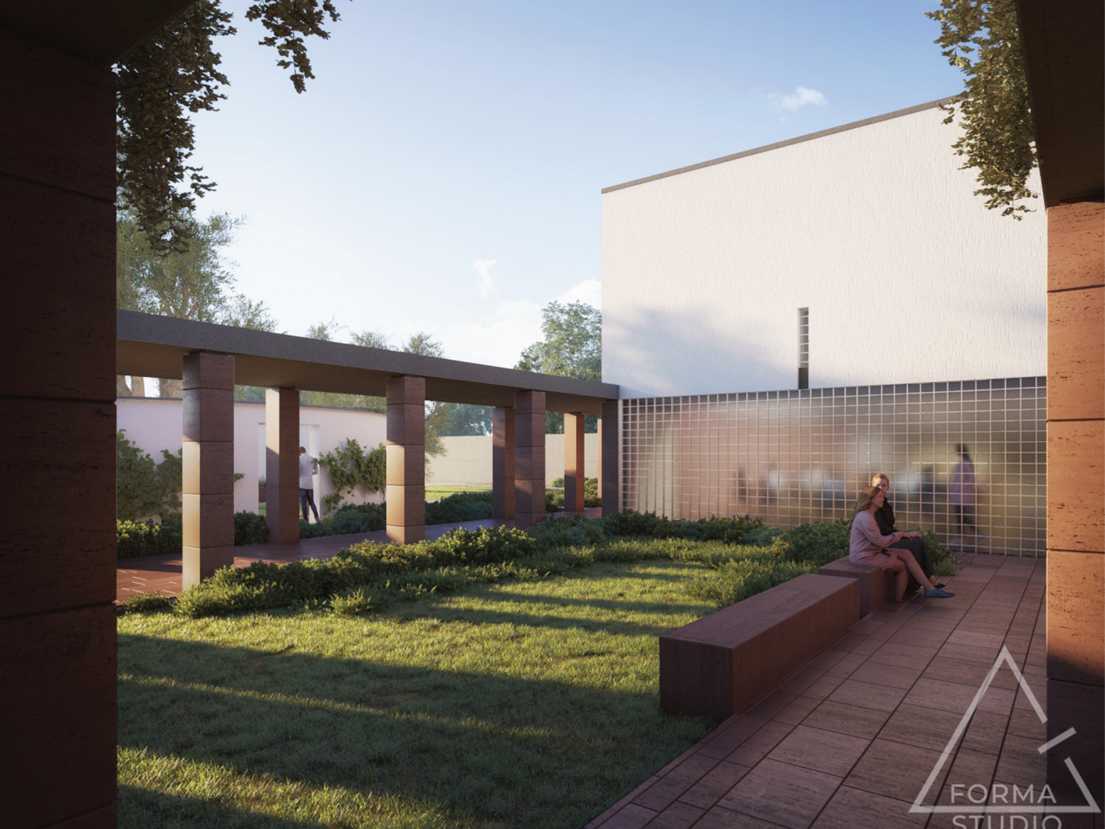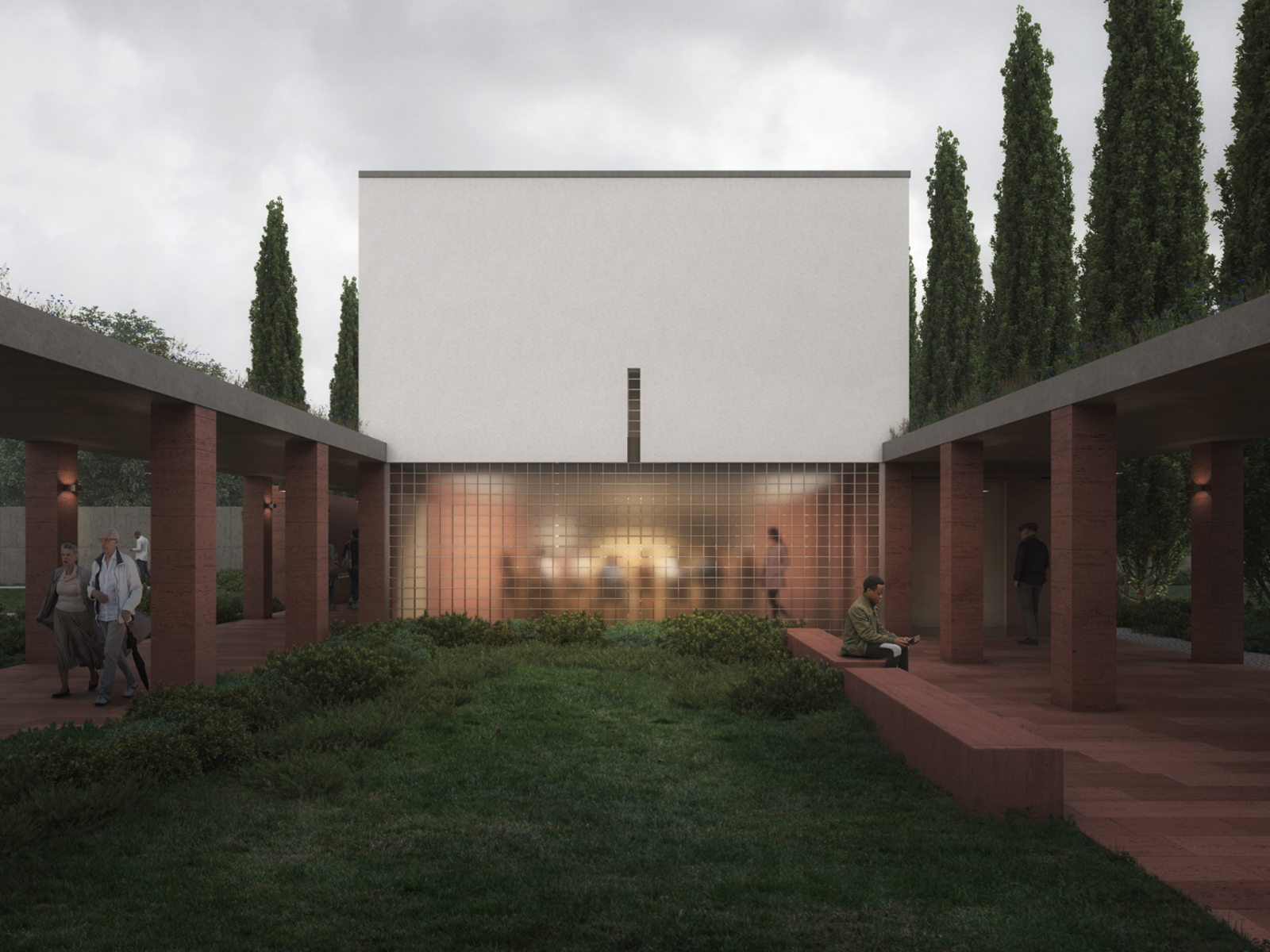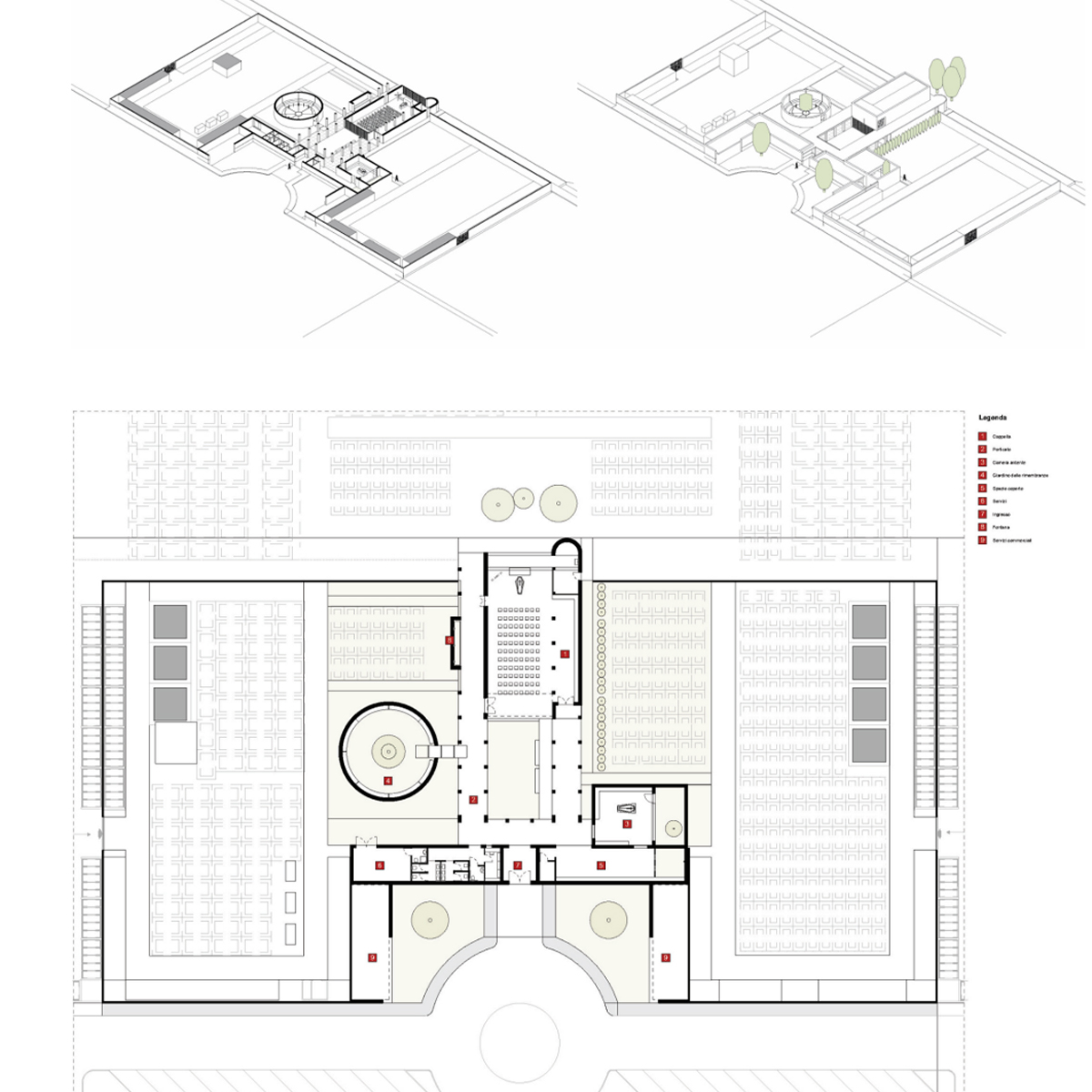 Dal porticato si accede alla Cappella, uno spazio regolare e sobrio nel quale la luce viene mitigata dalle pareti in vetromattone poste sui lati corti del piano terra. La camera ardente è un ambiente essenziale dove domina un patio interno visibile sullo sfondo dall’unica vetrata. Attraversando il porticato si arriva al giardino delle rimembranze, spazio circolare scoperto, al centro del quale è posto un grande albero con attorno un’area verde ben delimitata e controllata, luogo nel quale vengono disperse le ceneri del defunto. Sempre dal porticato si arriva alla fontana, elemento lapideo e scultoreo. In prossimità dell’ingresso vi sono il blocco servizi igienici, mentre al di fuori delle mura sono posti i blocchi di servizi commerciali, volutamente definiti dai soli elementi strutturali per lasciare libera la gestione della distribuzione interna a seconda delle necessità. L’oggetto materico dominante di tutto il progetto è il basamento in trachite che si ripete nei corpi architettonici definendo una fascia orizzontale ben marcata e distinta dal bianco degli elementi soprastanti.