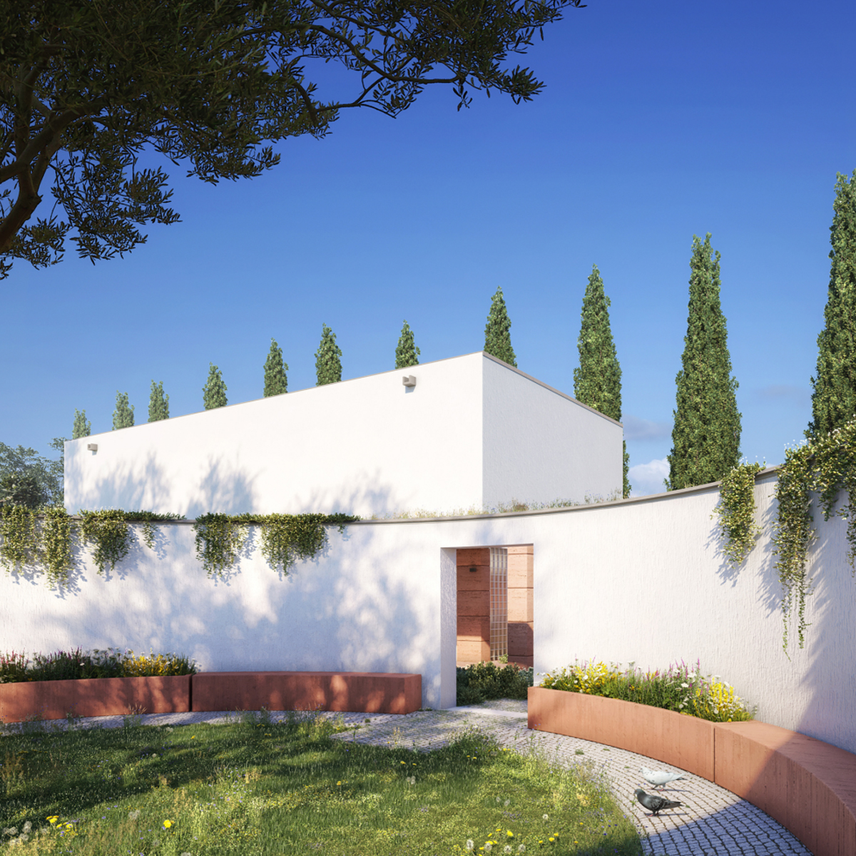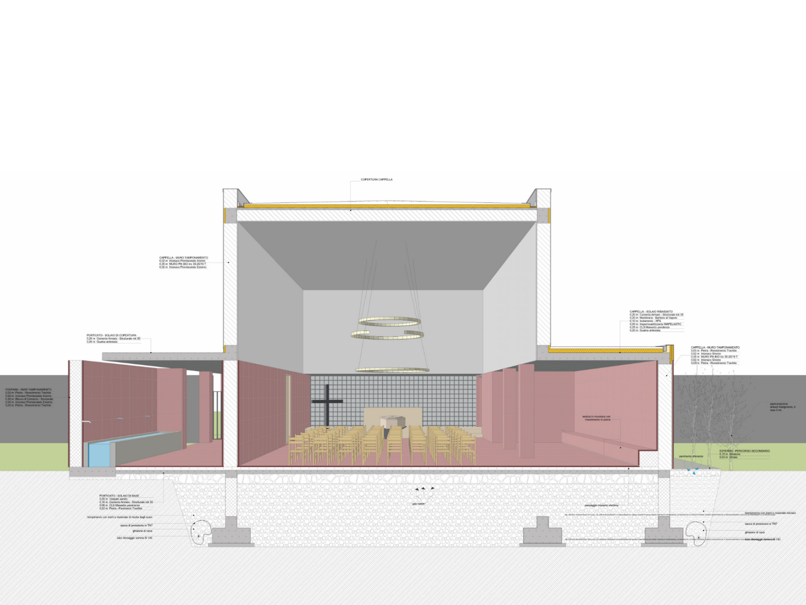 L’intervento riguarda la nuova costruzione della Cappella nel Cimitero di S’erbagusa nel Comune di Macomer. Oltre alla richiesta della S.A. di realizzare quest’unica struttura il progetto ha sviluppato un sistema architettonico composto da più architetture. Tali elementi sono stati inseriti in un lotto di progetto già perimetrato permettendo agli stessi di fungere da “confine architettonico” visivo e fisico tra questo intervento e futuri ampliamenti. La scelta di definire volumi separati nasce dall’idea di realizzare un sistema architettonico che potesse svilupparsi per più stralci funzionali. Tutti i corpi architettonici sono collegati da un percorso coperto porticato che, oltre ad offrire uno spazio controllato nel quale si affacciano i volumi e a gestire i flussi dei visitatori in maniera controllata, definisce una corte centrale utile a conferire una visuale ampia dell’ingresso.