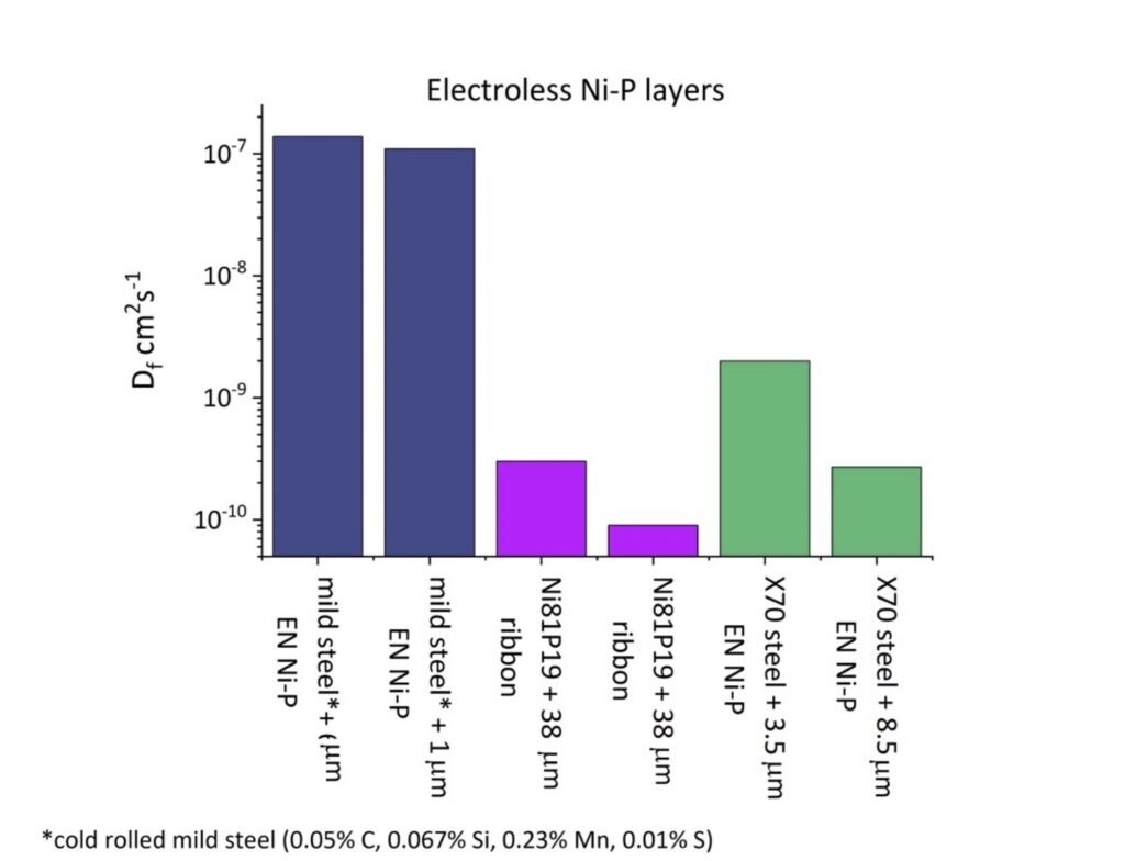 The review summarizes literature references that studied electroless Ni-P coatings as HPB. Melt spun Ni81P19 alloys, electroless Ni-P coatings on mild steel and electroless Ni-P coatings on API X70 steel, showing that Ni-P coatings have very low hydrogen diffusion coefficients Df.