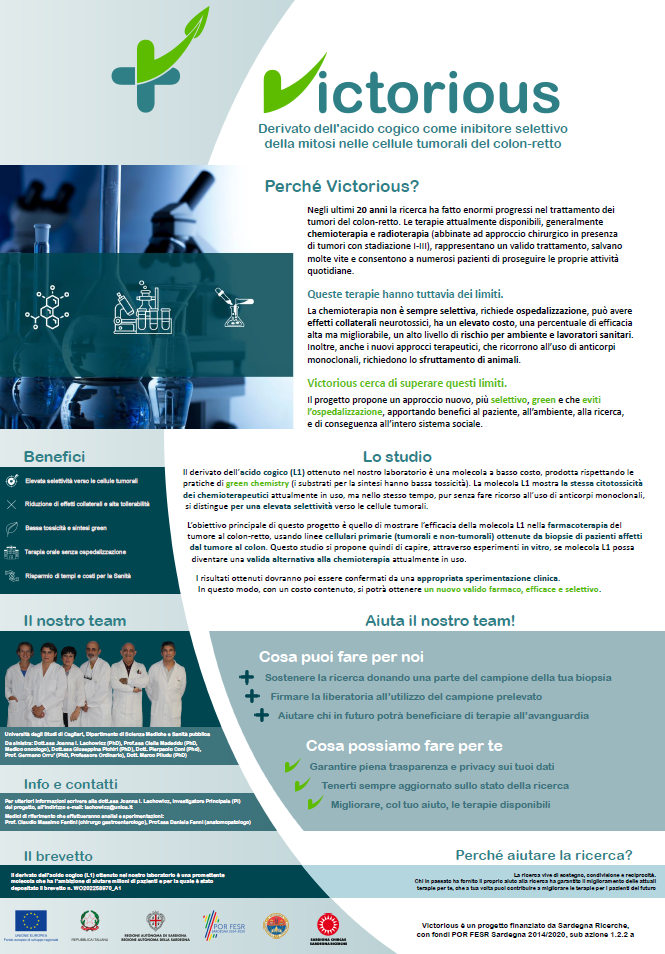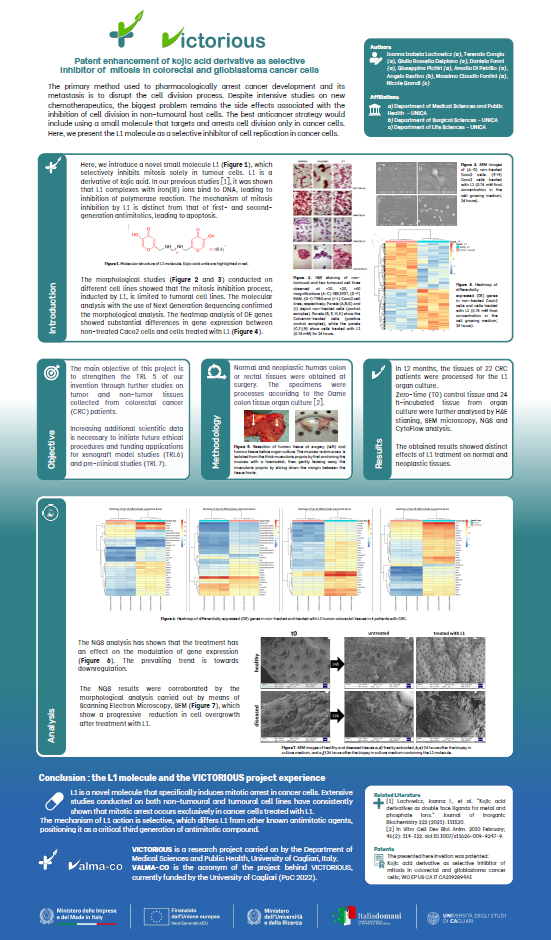 Poster: Patent enhancement of kojic acid derivative as selective inhibitor of mitosis in colorectal and glioblastoma cancer cells (Joanna Izabela Lachowicz, Terenzio Congiu, Giulia Rossella Delpiano, Daniela Fanni, Giuseppina Pichiri, Amalia Di Petrillo, Angelo Restivo, Massimo Claudio Fantini, Nicole Grandi).